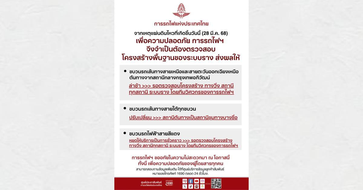 จากเหตุแผ่นดินไหวที่เกิดขึ้นวันนี้ (28 มี.ค.) เพื่อความปลอดภัย การรถไฟฯ จึงจำเป็นต้องตรวจสอบโครงสร้างพื้นฐานของระบบราง ส่งผลให้