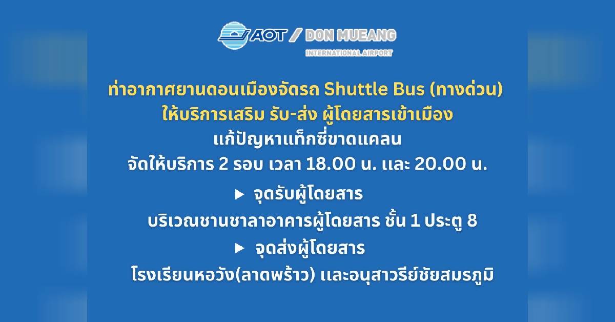 เนื่องจากเหตุแผ่นดินไหวในช่วงบ่ายที่ผ่านมา ส่งผลให้ระบบขนส่งสาธารณะมีการหยุดให้บริการบางเส้นทาง และมีการปิดเส้นทางจราจรบางส่วน ทำให้การจราจรโดยรอบกรุงเทพมหานครติดขัด เป็นเหตุให้รถแท็กซี่ไม่สามารถเข้ามาให้บริการรับผู้โดยสารที่ท่าอากาศยานดอนเมือง (ทดม.) ได้อย่างเพียงพอ เพื่อเป็นการอำนวยความสะดวกผู้โดยสาร ให้สามารถเดินทางเข้าเมืองได้ ทดม.ได้จัดให้มีรถ Shuttle Bus จำนวน 40 ที่นั่ง ให้บริการเสริมในช่วงเวลานี้เป็นการชั่วคราว โดยรถ Shuttle Bus จะจอดรอรับผู้โดยสารบริเวณชานชาลาอาคารผู้โดยสาร ชั้น 1 ประตู 8 ไปยังจุดหมายปลายทาง โรงเรียนหอวัง ฝั่งถนนวิภาวดีรังสิต และ อนุสาวรีย์ชัยสมรภูมิ ตามลำดับ โดย ทดม.จะให้บริการต่อเนื่องไปจนกว่าสถานการณ์การขาดแคลนแท็กซี่จะคลี่คลาย