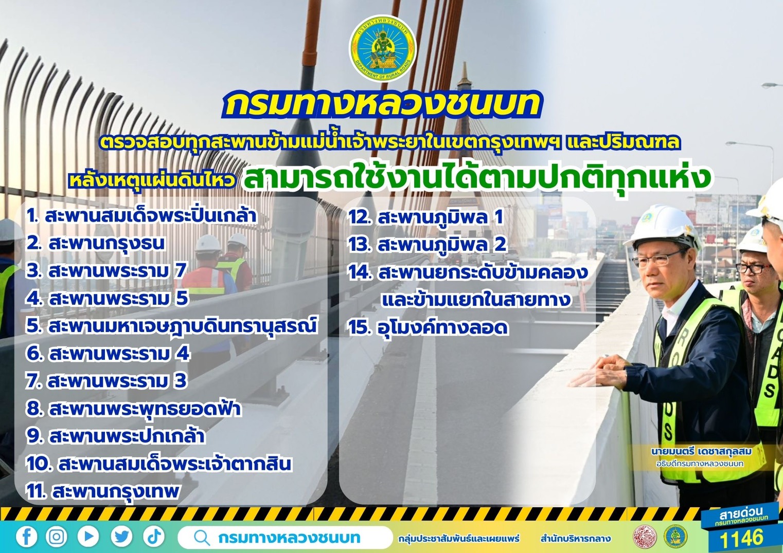 กรุงเทพ 28 มี.ค.-กรมทางหลวงชนบท ตรวจสอบทุกสะพานข้ามแม่น้ำเจ้าพระยาในเขตกรุงเทพฯ และปริมณฑล หลังเหตุแผ่นดินไหว สามารถใช้งานได้ตามปกติทุกแห่ง