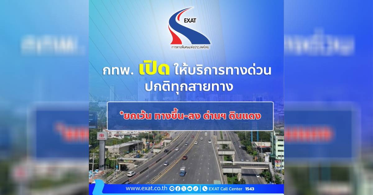 การทางพิเศษแห่งประเทศไทย ขอยืนยันว่าสามารถใช้ทางพิเศษได้อย่างปลอดภัย ตามปกติ และเปิดให้ใช้ทางพิเศษได้ทุกสายทาง ยกเว้น ทางขึ้นและทางลง บริเวณดินแดง เนื่องจากที่มีเหตุ เศษวัสดุตกหล่นลงบนพื้นทางพิเศษ ซึ่งอยู่ในขั้นตอนการตรวจสอบความปลอดภัยของโครงสร้างเพื่อประเมินการเปิดให้ใช้งานโดยเร็วที่สุด.-513.-สำนักข่าวไทย