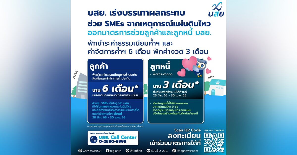 นอกจากนี้ บสย. ยังได้เฝ้าติดตามสถานการณ์และผลกระทบอย่างใกล้ชิดในพื้นที่จังหวัดอื่นๆ ที่มีแนวโน้มเป็นพื้นที่ประสบภัย พร้อมมอบหมายให้สำนักงานเขต บสย. ทั่วประเทศเร่งสำรวจตรวจสอบและสื่อสารประชาสัมพันธ์มาตรการช่วยเหลือดังกล่าว โดย บสย. เร่งลงพื้นที่เพื่อให้ความช่วยเหลืออื่นๆ เพิ่มเติม ทั้งนี้ ผู้ประกอบการ SMEs ทั้งกลุ่มลูกค้า และลูกหนี้ บสย. ที่อยู่ในพื้นที่ประสบเหตุการณ์แผ่นดินไหว สามารถปรึกษาหรือสอบถามข้อมูลเพิ่มเติมและรายละเอียดการเข้าร่วมมาตรการ ได้ที่สำนักงานเขตในพื้นที่ หรือ ช่องทาง LINE OA TCG First: @tcgfirst และ บสย. Call Center โทร. 02-890-9999.-515 สำนักข่าวไทย