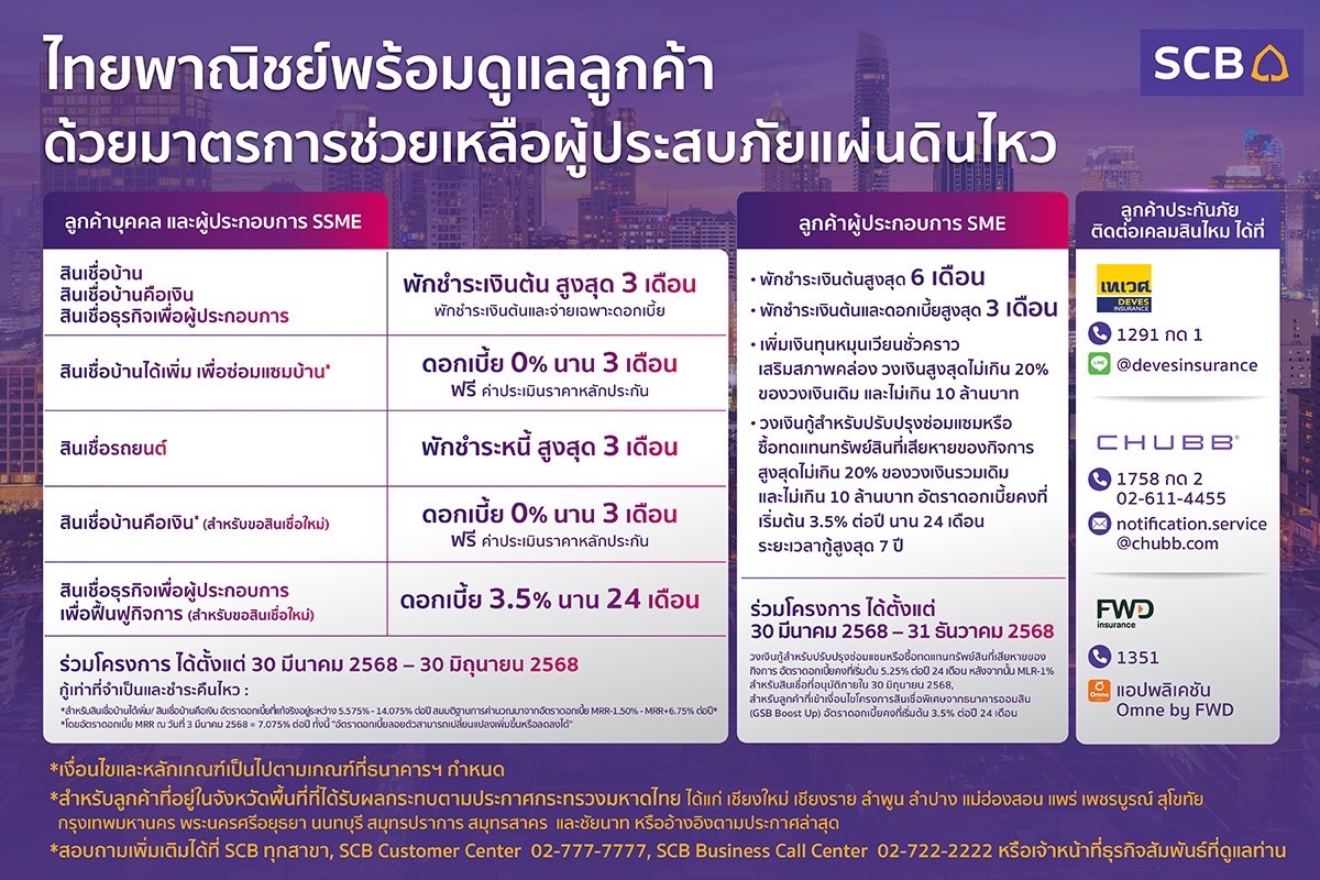 กรุงเทพฯ 30 มี.ค. – ธนาคารไทยพาณิชย์ออกมาตรการเร่งด่วนช่วยลูกค้าที่ได้รับผลกระทบจากเหตุการณ์แผ่นดินไหว ทั้งมาตรการพักชำระและสินเชื่อพิเศษเพื่อซ่อมแซมบ้านและกิจการ ประกาศพักชำระเงินต้นแก่ลูกค้าสินเชื่อบ้านนาน 3 เดือน และให้สินเชื่อแก่ลูกค้าที่ต้องการซ่อมแซมบ้านดอกเบี้ย 0% นาน 3 เดือน พร้อมมอบสินเชื่อเพื่อฟื้นฟูกิจการแก่ผู้ประกอบการรายย่อยและเอสเอ็มอี อัตราดอกเบี้ยเริ่มต้น 3.5% ต่อปี นาน 24 เดือน