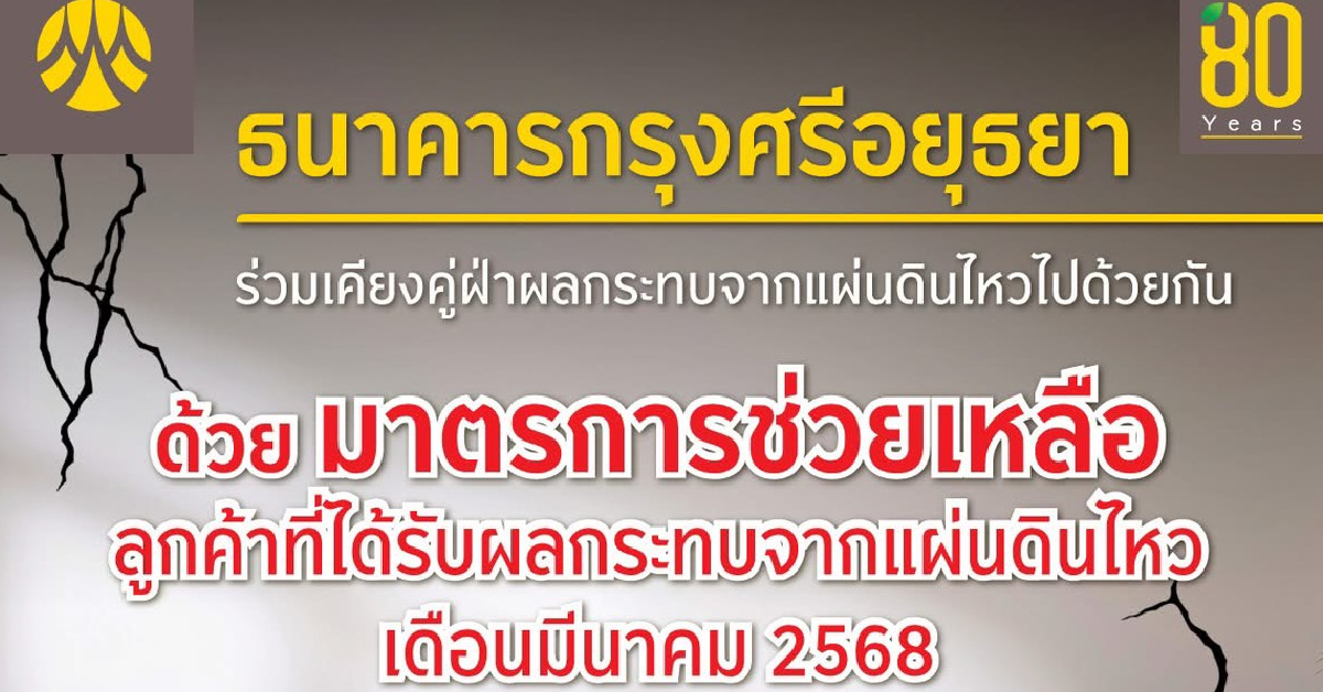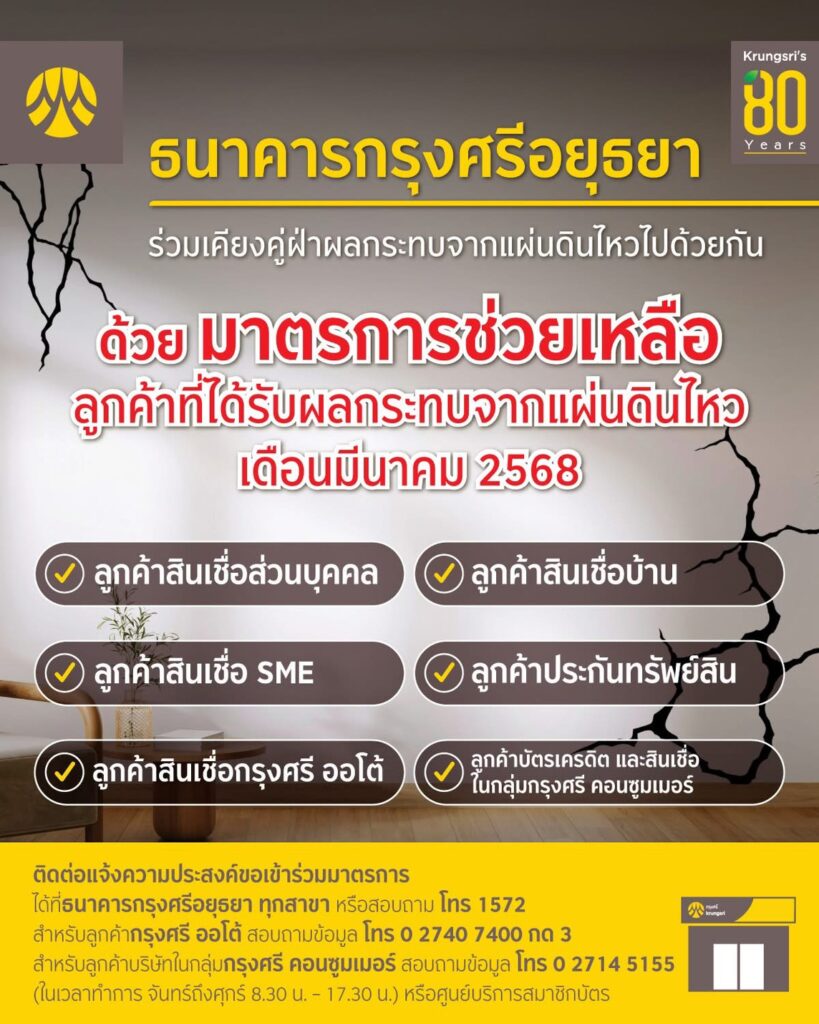 การพิจารณาตามมาตรการช่วยเหลือลูกค้าที่ได้รับผลกระทบจากแผ่นดินไหว การพิจารณาเป็นรายกรณีตามหลักเกณฑ์และเงื่อนไขของธนาคารกรุงศรีอยุธยา และบริษัทในกลุ่มกรุงศรี คอนซูมเมอร์ ตั้งแต่วันนี้ถึง 30 ก.ย. 68