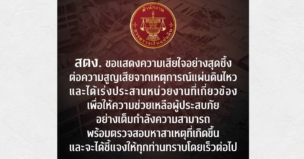 สำนักงานการตรวจเงินแผ่นดิน (สตง.) เปิดเผยว่า จากกรณีอาคารที่ทำการสำนักงานการตรวจเงินแผ่นดินแห่งใหม่ บริเวณถนนกำแพงเพชร 2 เขตจตุจักร กรุงเทพมหานคร ได้รับความเสียหายจากเหตุการณ์ความรุนแรงของแผ่นดินไหวในพื้นที่กรุงเทพมหานคร เมื่อวันที่ 28 มีนาคม 2568 ส่งผลให้มีผู้เสียชีวิต ผู้ได้รับบาดเจ็บ และผู้สูญหาย ซึ่งถือเป็นโศกนาฏกรรมที่สร้างความสูญเสียอย่างใหญ่หลวง สตง. ขอแสดงความเสียใจอย่างสุดซึ้งต่อครอบครัวของผู้เสียชีวิตและผู้ได้รับบาดเจ็บ โดยภายหลังจากที่ได้รับรายงานกรณีเหตุการณ์ดังกล่าว ผู้ว่าการตรวจเงินแผ่นดิน พร้อมผู้บริหารและเจ้าหน้าที่ของ สตง. ได้ลงพื้นที่อย่างเร่งด่วน พร้อมประสานงานกับหน่วยงานที่เกี่ยวข้องเพื่อให้ความช่วยเหลือผู้ประสบภัยอย่างเต็มกำลังความสามารถ และจะได้เร่งดำเนินการตรวจสอบหาสาเหตุที่เกิดขึ้นและแนวทางแก้ไข พร้อมชี้แจงให้ประชาชนได้รับทราบโดยเร็วต่อไป