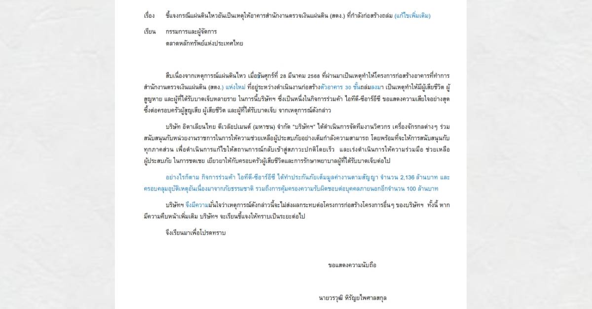 ไอทีดี ทำหนังสือถึงตลาดหลักทรัพย์ฯ ชี้แจงกรณีแผ่นดินไหวอันเป็นเหตุให้อาคารสำนักงานตรวจเงินแผ่นดิน (สตง.) ที่กำลังก่อสร้างถล่มเมื่อวันศุกร์ที่ 28 มีนาคม 2568 โครงการนี้อยู่ระหว่างก่อสร้างตัวอาคาร 30 ชั้น การถล่มลงมาเป็นเหตุให้มีผู้เสียชีวิต ผู้สูญหาย และผู้ที่ได้รับบาดเจ็บหลายราย ในการนี้บริษัทฯ ซึ่งเป็นหนึ่งในกิจการร่วมค้า ไอทีดี-ซีอาร์อีซี ขอแสดงความเสียใจอย่างสุด ซึ้งต่อครอบครัวผู้สูญเสีย ผู้เสียชีวิต และผู้ที่ได้รับบาดเจ็บ