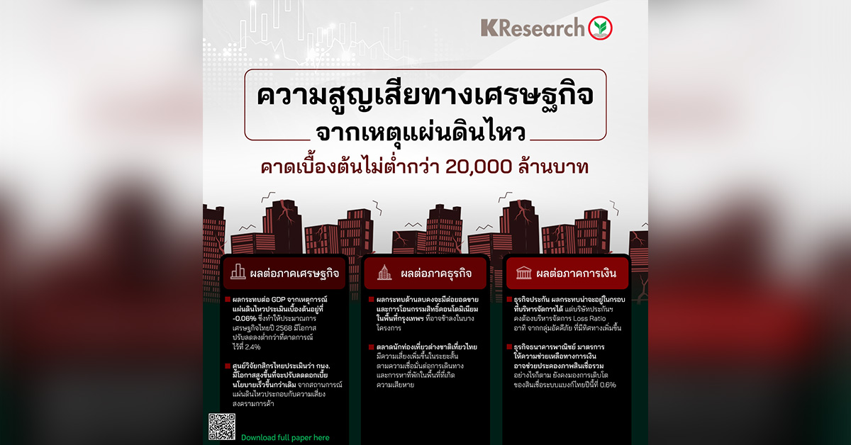 ด้านบริษัท ศูนย์วิจัยกสิกรไทย ประเมินความสูญเสียทางเศรษฐกิจจากเหตุแผ่นดินไหว คาดเบื้องต้นไม่ต่ำกว่า 20,000 ล้านบาท หรือกระทบ GDP -0.06% หลักๆ มาจากการหยุดชะงักหรือเลื่อนออกไปของกิจกรรมทางเศรษฐกิจ รวมถึงกำลังซื้อที่อาจลดลง เพราะธุรกิจและครัวเรือนต้องโยกกระแสเงินสด/รายได้ไปใช้เพื่อการตรวจสอบความเสียหายและซ่อมแซมอาคาร และ หากรวมความเสียหายต่ออาคาร ทรัพย์สิน การทรุดตัว/การสั่นสะเทือนของอาคารบางแห่งเพิ่มเติม รวมถึงการซ่อมแซมและการเคลมประกันหลังจากนี้ ผลกระทบจะมากกว่านี้