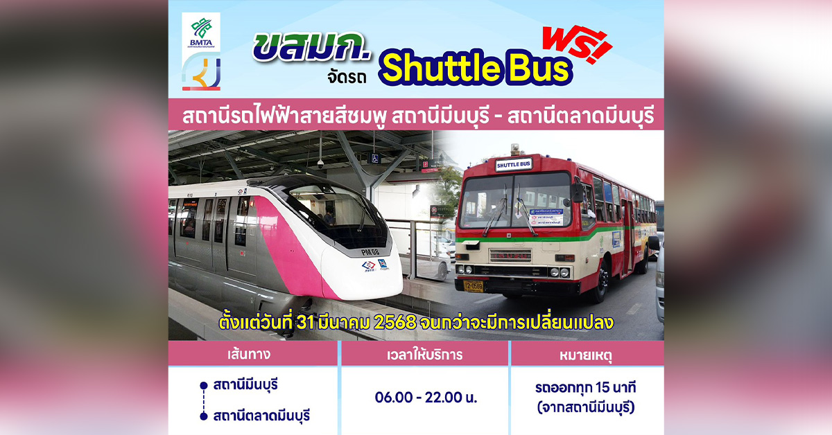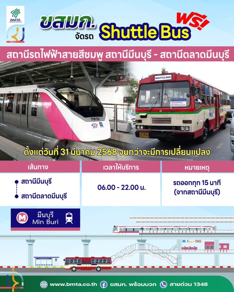 องค์การขนส่งมวลชนกรุงเทพ (ขสมก.) จัดเดินรถเฉพาะกิจให้บริการประชาชนฟรี เพื่ออำนวยความสะดวกในการเชื่อมต่อการเดินทาง รถไฟฟ้ามหานคร สายสีชมพู (MRT สายสีชมพู) ช่วงสถานีตลาดมีนบุรี (PK29) – สถานีมีนบุรี (PK30) ต้องงดให้บริการชั่วคราว ตั้งแต่วันที่ 31 มีนาคมนี้เป็นต้นไป