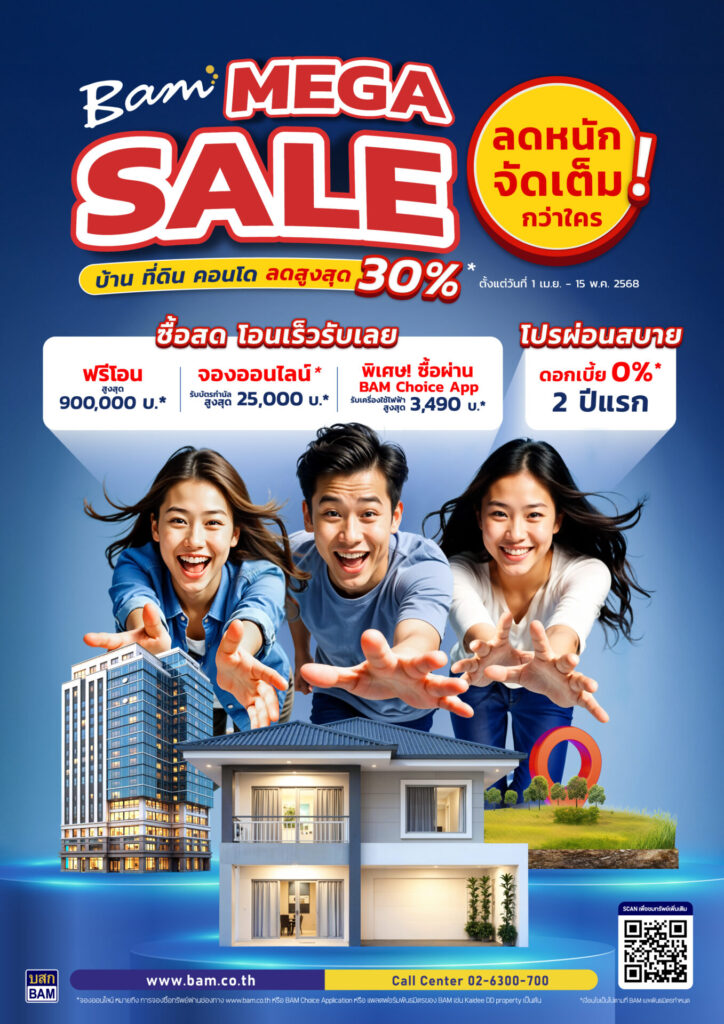 กรุงเทพฯ 1 เม.ย.- BAM จัดแคมเปญ “BAM MEGA SALE” ลดหนักจัดเต็มกว่าใคร ลดสูงสุด 30% ตั้งแต่วันนี้ ถึง 15 พฤษภาคม 68 คัดทรัพย์คุณภาพ ทำเลดี ทั่วประเทศ ทั้ง บ้าน ที่ดิน คอนโด กว่า 3,000 รายการ มาลดราคาแบบลดหนักจัดเต็ม