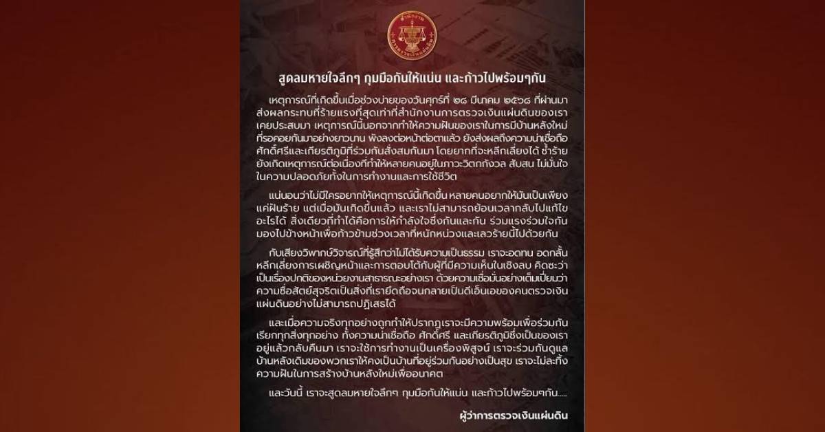 กรุงเทพฯ 2 เม.ย. – ผู้ว่าการ สตง. เจอดราม่า ออกแถลงการณ์ให้กำลังใจเจ้าหน้าที่ เสียงวิจารณ์มาแน่น