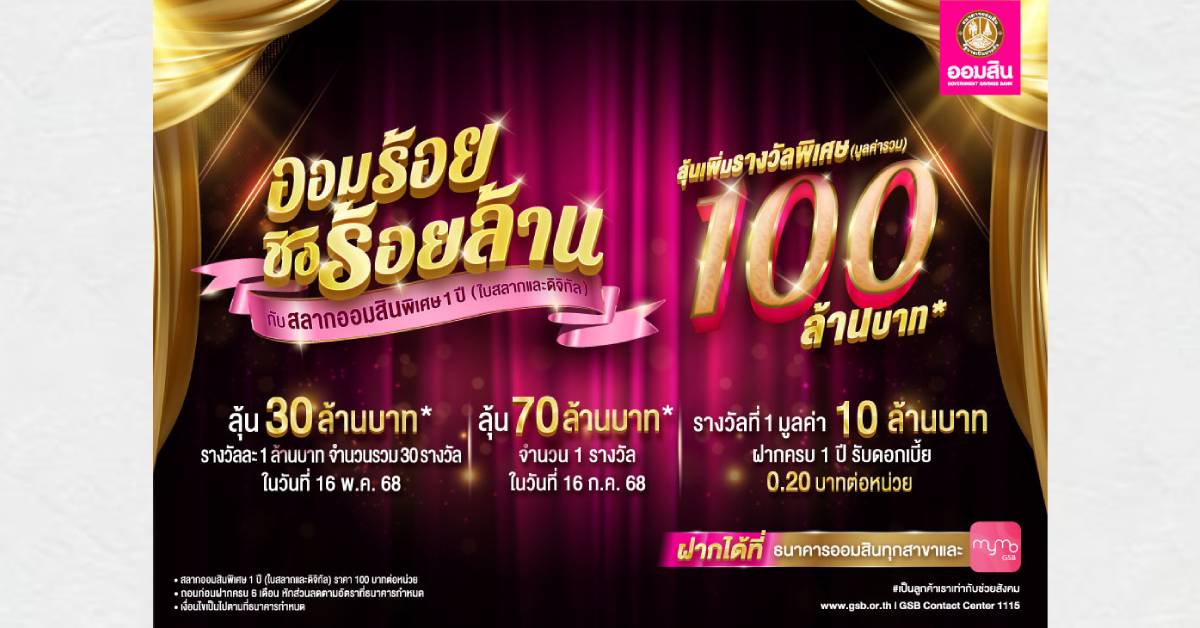 นายวิทัย รัตนากร ผู้อำนวยการธนาคารออมสิน เปิดเผยว่า เนื่องในวาระวันคล้ายวันสถาปนาธนาคารออมสิน วันที่ 1 เมษายน 2568 ธนาคารได้จัดกิจกรรมส่งเสริมการออมให้ประชาชนครั้งใหญ่ ประเดิมด้วยแคมเปญแห่งปี “ออมร้อย ชิงร้อยล้าน” กับสลากออมสินพิเศษ 1 ปี ทั้งแบบใบสลากและสลากดิจิทัล ลุ้นรับรางวัลพิเศษมูลค่ารวม 100 ล้านบาท มอบโชคสำหรับผู้ถูกรางวัลพิเศษ มูลค่า 70 ล้านบาท งวดวันที่ 16 กรกฎาคม 2568 เพียง 1 รางวัลเท่านั้น และรางวัลพิเศษ มูลค่า 1 ล้านบาท งวดวันที่ 16 พฤษภาคม 2568 จำนวน 30 รางวัล