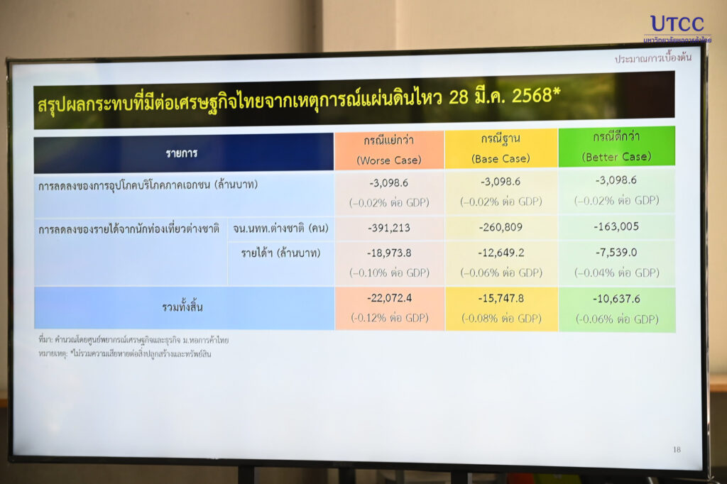 ศูนย์พยากรณ์เศรษฐกิจและธุรกิจ มหาวิทยาลัยหอการค้าไทย ประเมินผลกระทบที่มีต่อเศรษฐกิจไทยจากเหตุการณ์แผ่นดินไหวเมื่อวันที่ 28 มี.ค.68 โดยผลกระทบทางเศรษฐกิจในกรณีฐานอยู่ที่ 15,747.8 ล้านบาท (0.08% ของ GDP) แบ่งเป็นผลกระทบต่อการบริโภคภาคเอกชน 3,098.6 ล้านบาท (0.02% ต่อ GDP) และรายได้จากนักท่องเที่ยวต่างชาติ 12,649.2 ล้านบาท (0.06% ต่อ GDP%) โดยในกรณีแย่กว่าและดีกว่า ผลกระทบรวมอาจจะอยู่ในช่วง 10,637.6-22,072.4 ล้านบาท (0.06-0.12% ของ GDP) ขึ้นอยู่กับระยะเวลาและความรุนแรงของผลกระทบต่อภาคการท่องเที่ยว