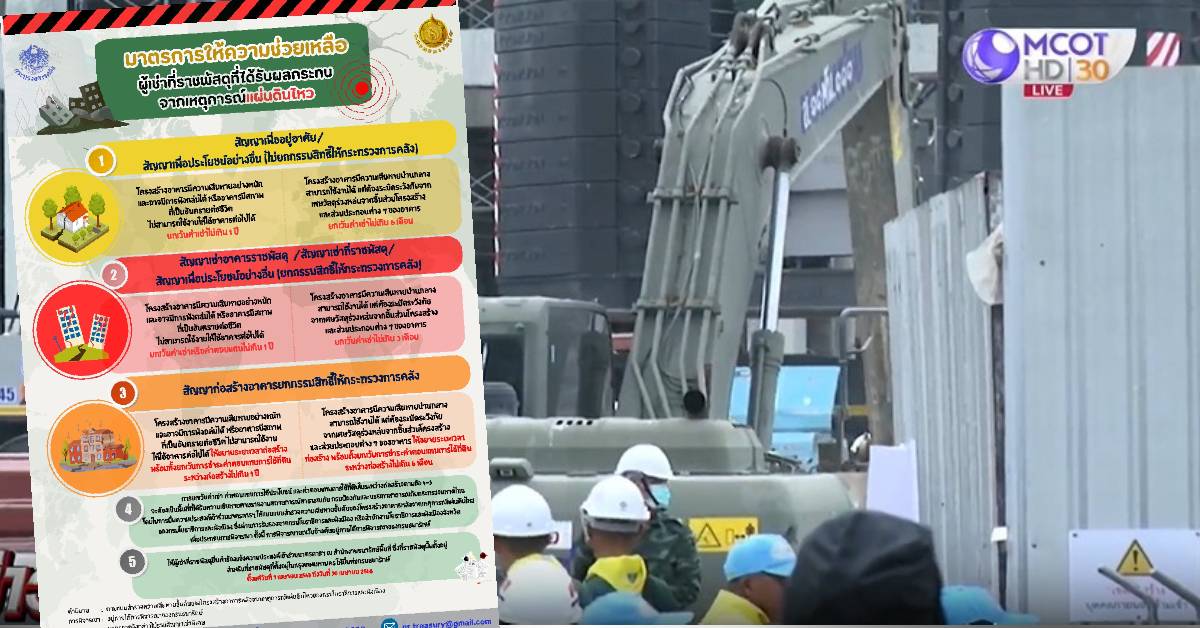 กรุงเทพฯ 3 เม.ย. – กรมธนารักษ์ออกมาตรการยกเว้นค่าเช่า ช่วยเหลือให้กับผู้เช่าที่ราชพัสดุ ที่ได้รับผลกระทบจากเหตุการณ์แผ่นดินไหว