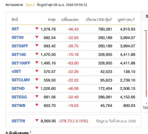 กรุงเทพฯ 8 เม.ย. – หุ้นไทยเปิดตลาดร่วง 51 จุด เช้านี้ ดัชนี SET อ่อนค่าสุดที่ 1,074 จุด ทองคำร่วง-บาทอ่อนค่าลงหนัก ผันผวน ผลกระทบการขึ้นภาษีของนายโดนัล ทรัมป์ ประธานาธิบดีสหรัฐ เพราะหวั่นเศรษฐกิจทั่วโลกตกต่ำครั้งใหญ่ หรือ Great Depression ในรอบ 100 ปี โบรกเกอร์ปรับลดเป้าหมายดัชนี SET อาจหลุด 1,000 จุด หากภาษีสหรัฐกระทบยาวนาน ลุ้นไทยหลุด