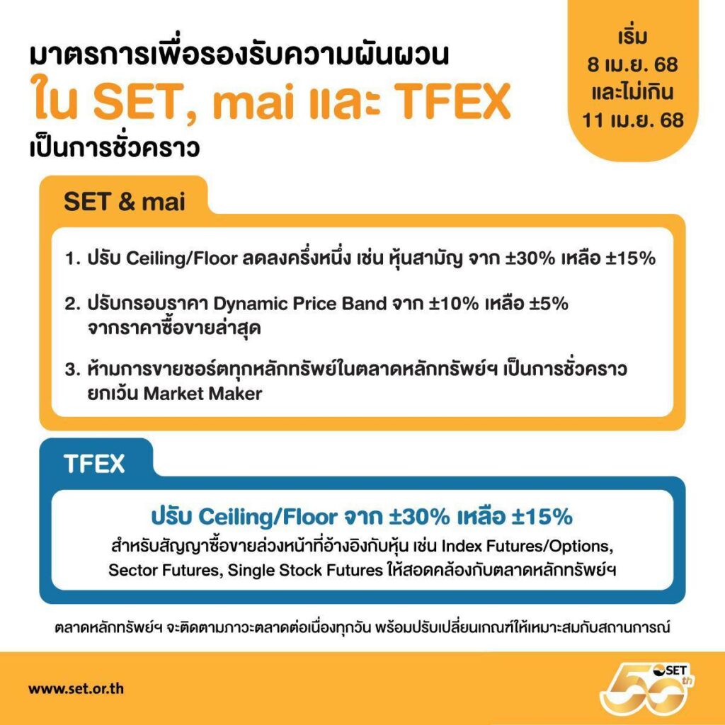 หุ้นไทยเปิดตลาดร่วง 51 จุด ในเช้านี้ ดัชนี SET อ่อนค่าสุดที่ 1,074 จุด แม้ตลาดหลักทรัพย์แห่งประเทศไทย คาดการณ์ล่วงหน้าว่าหุ้นไทยจะผันผวนตามตลาดโลก และมาตรการเพื่อรองรับความผันผวนจาก Trump’s Tariff Effect บังคับใช้ ทั้งการซื้อขายหลักทรัพย์ฯ และตลาดสัญญาซื้อขายล่วง TFEX ในช่วงวันที่ 8-11 เม.ย.68 โดยปรับราคาเสนอซื้อขายสูงสุดและต่ำสุด Ceiling/Floor ลดลงครึ่งหนึ่ง จาก 30% เหลือ 15% ,ปรับกรอบราคา Dynamic Price Band ลดลงครึ่งหนึ่งจาก 10% เหลือ 5% , ไม่อนุญาตให้ Short Sell ยกเว้น Market Maker ส่วนตลาด TFEX ทั้ง Index Futures/Options Sector Futures Single Stock Futures ปรับ Ceiling/Floor ลดลงครึ่งหนึ่ง สำหรับ Equity based product จาก 30% เหลือ 15%