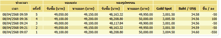 ด้าน ราคาทองคำในไทย ผันผวน ร่วงลงตาม ตลาดโลกเปิดตลาดวันนี้ ร่วง 550 บาท/บาททองคำ จนถึง เวลา 09.59 น.วันนี้ ทองแท่ง ขายออก บาทละ 49,150 บาท ทองรูปพรรณ ขายออก 49,950 บาท ในขณะที่ราคาปิดวานนี้ (7 เม.ย.) ของสัญญาทองคำตลาด COMEX (Commodity Exchange) ส่งมอบเดือน มิ.ย. ร่วงลง 61.80 ดอลลาร์ หรือ 2.04% ปิดที่ 2,973.6 ดอลลาร์/ออนซ์ นับเป็นราคาปิดร่วงลงติดต่อกันเป็นวันที่ 3 ในวันจันทร์ ตลาดเริ่มเทขายทองคำและหันไปถือครองสกุลเงินที่ปลอดภัย รวมถึงสกุลเงินดอลลาร์ เพราะคาดมีความเสี่ยงที่เศรษฐกิจโลกจะเกิดภาวะถดถอย จากมาตรการภาษีศุลกากรของสหรัฐฯ. -511-สำนักข่าวไทย