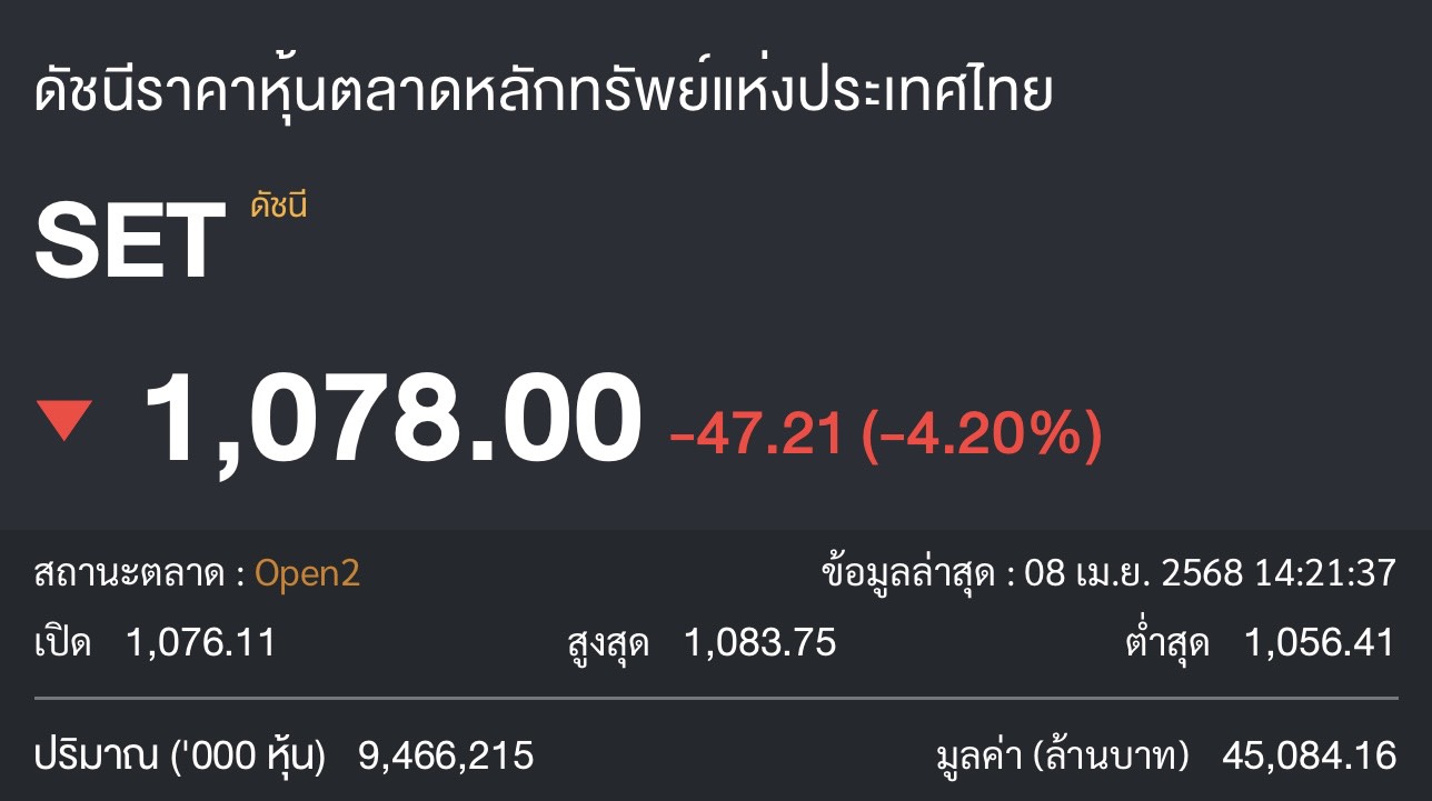 ผู้สื่อข่าวรายงาน ความเคลื่อนไหวดัชนีตลาดหุ้นไทยในภาคเช้าวันนี้ 8 เม.ย.68 ปิดที่ระดับ 1,077.48 จุด ลดลง 47.73 จุด หรือเปลี่ยนแปลง 4.24% ในช่วงระหว่างเปิดการซื้อขายภาคเช้าดัชนีแกว่งตัวแตะกรอบสูงสุดและต่ำสุดที่ระดับ 1,083.75 – 1,056.41 จุด โดยมีมูลค่าการซื้อขายอยู่ที่ 39,977.61 ล้านบาท พร้อมทำ New Low ใหม่ปีนี้ที่ 1,056.41 จุด (ต่ำสุด รอบกว่า 5 ปีเทียบกับระดับ 1,050.72 จุดทำไว้เมื่อ 25 มีค. 2020) ตามการร่วงลงของตลาดหุ้น ภูมิภาคที่ปรับลดลงไปตั้งแต่วานนี้ เนื่องจากเกิดภาวะ Risk Off (ขายสินทรัพย์เสี่ยง เข้าสู่สินทรัพย์ปลอดภัย) เพราะกังวลต่อ สงครามการค้า ตอบโต้ไปมาระหว่างสหรัฐฯ จีน อียู ส่วนปัจจัยบวก ช่วยหนุนตลาดภูมิภาค คือ ลุ้น Trump อาจขยายเวลาเส้นตาย Reciprocal Tariffs ที่จะเริ่มมีผลวันพรุ่งนี้ (9 เม.ย.)