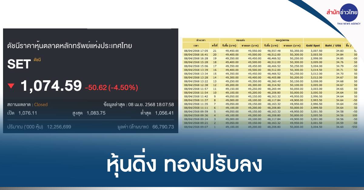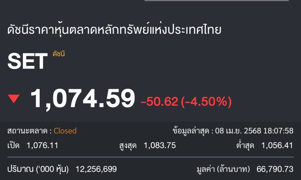 ขณะผู้สื่อข่าวรายงานว่า วันนี้ (8 เม.ย..68) ดัชนีตลาดหุ้นไทยปิดที่ 1,074.59 จุด ลดลง -50.62 จุด หรือ -4.50% มีมูลค่าการซื้อขาย 66,714.48 ล้านบาท แรงกดดันหลักเป็นไปตามภาวะตลาดหุ้นทั่วโลกที่ช่วงนี้ผันผวนหนักจากความกังวลสงครามการค้า (Trade War 2.0) โดยดัชนี SET ลงไปทำจุดต่ำสุดของวัน (LOW) ที่บริเวณ 1,056.41 จุด ปรับตัวลดลง 68.80 จุด และต่ำสุดของปีนี้ (ต่ำสุด รอบกว่า 5 ปีเทียบกับระดับ 1,050.72 จุดทำไว้เมื่อ 25 มีค. 2020)
