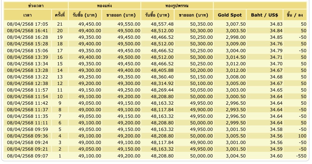 สมาคมค้าทองคำ ประกาศราคาทองคำวันนี้ (8 เม.ย.) เปลี่ยนแปลงทั้งหมด 21 ครั้ง ก่อนที่จะปิดตลาดในเวลา 17:05 น. ปรับลดลง 200 บาท จากเมื่อวาน (7 เม.ย. 68) โดยราคาทองคำแท่ง 96.5% รับซื้อบาทละ 49,450.00 บาท ขายออกบาทละ 49,550.00 บาท ราคาทองคำรูปพรรณ 96.5% รับซื้อบาทละ 48,557.48 บาท ขายออกบาทละ 50,350.00 บาท