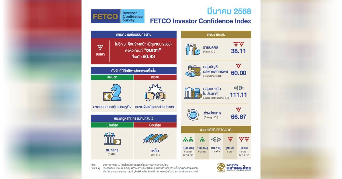 นายกอบศักดิ์ ภูตระกูล ประธานกรรมการสภาธุรกิจตลาดทุนไทย เปิดเผยดัชนีความเชื่อมั่นนักลงทุน(FETCO Investor Confidence Index) ผลสำรวจในเดือนมีนาคม 2568 (สำรวจระหว่างวันที่ 21-31 มีนาคม 2568) พบว่า ดัชนีในอีก 3 เดือนข้างหน้ายังคงอยู่ในเกณฑ์ “ซบเซา” ที่ระดับ 60.93 ความเชื่อมั่นกลุ่มนักลงทุนบุคคลอยู่ในเกณฑ์ “ซบเซาอย่างมาก” กลุ่มบัญชีบริษัทหลักทรัพย์ และกลุ่มนักลงทุนต่างประเทศอยู่ในเกณฑ์ “ซบเซา” ในขณะที่กลุ่มกลุ่มนักลงทุนสถาบัน อยู่ในเกณฑ์ “ทรงตัว” หมวดธุรกิจที่น่าสนใจมากที่สุด คือ หมวดธนาคาร (BANK) หมวดธุรกิจที่ไม่น่าสนใจมากที่สุด คือ หมวดเหล็ก (STEEL)