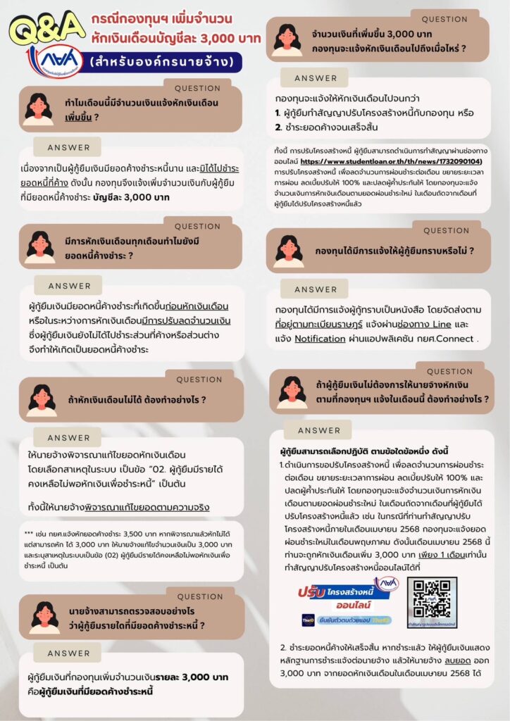 ดร.นันทวัน วงศ์ขจรกิตติ ผู้จัดการกองทุนเงินให้กู้ยืมเพื่อการศึกษา เปิดเผยว่า กยศ.ได้แจ้งนายจ้างให้หักเงินเดือนผู้กู้ยืมที่ค้างชำระหนี้เพิ่มอีก 3,000 บาทนั้น กยศ. ขอชี้แจงว่า เนื่องด้วย กยศ. ได้ติดตามหนี้ผู้กู้ยืมทุกรายที่ยังมียอดหนี้ค้างชำระ รวมถึงผู้กู้ยืมที่อยู่ในระบบหักเงินเดือน ก่อนหน้านี้ กยศ. ได้แจ้งหักเงินเดือน แต่ไม่ได้นำยอดหนี้ค้างชำระเดิมของผู้กู้ยืมมารวมในการแจ้งหักเงินเดือนด้วย และแจ้งให้นำยอดหนี้ค้างชำระด้วยตนเองให้ครบถ้วน แต่ผู้กู้ยืมบางรายไม่ได้มีการชำระเงินดังกล่าวจึงทำให้มียอดหนี้ค้างสะสมเพิ่มขึ้น