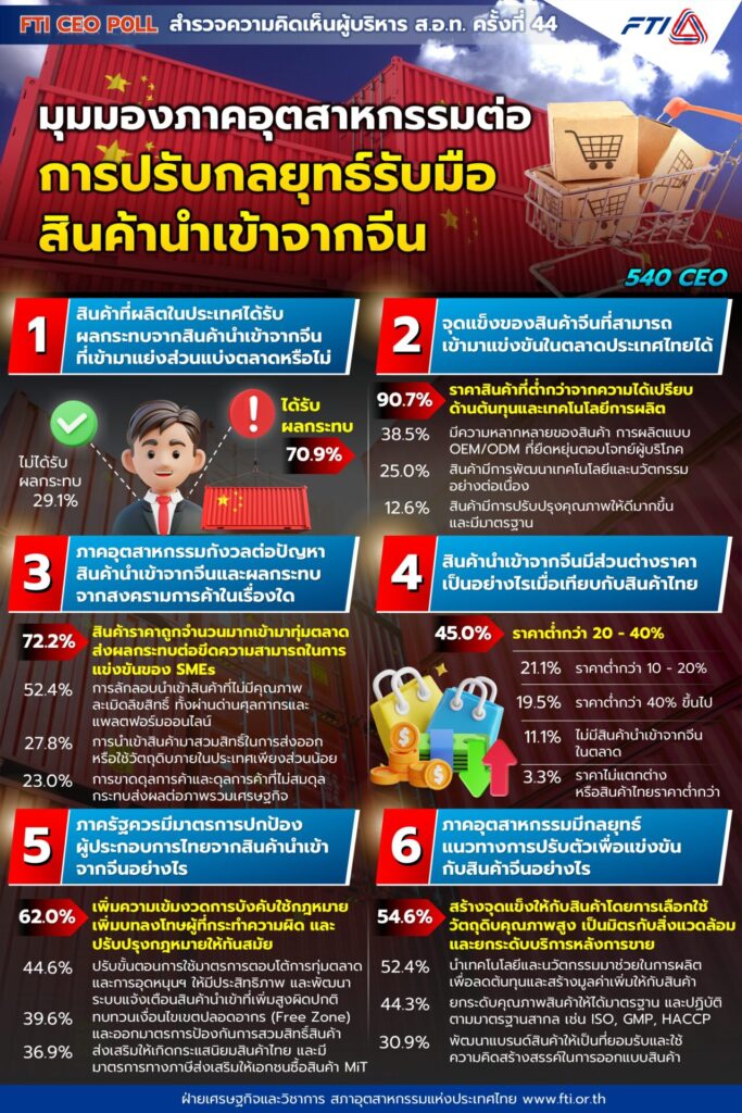 หม่อมหลวงปีกทอง ทองใหญ่ รองประธานสภาอุตสาหกรรมแห่งประเทศไทย (ส.อ.ท.) เปิดเผยผลการสำรวจ FTI CEO Poll ครั้งที่ 44 ในเดือนมีนาคม 2568 ภายใต้หัวข้อ “มุมมองภาคอุตสาหกรรมต่อการปรับกลยุทธ์รับมือสินค้านำเข้าจากจีน” พบว่า จากผลกระทบของสงครามการค้าระหว่างจีนและสหรัฐฯ ประกอบกับปัญหาการระบายอุปทานที่ผลิตเกินความต้องการในจีน (Oversupply) เป็นปัจจัยกดดันให้เกิดการทะลัก (Flooding) ของสินค้าจีนมายังภูมิภาคต่าง ๆ รวมถึงไทยและอาเซียน ผู้บริหาร ส.อ.ท. ส่วนใหญ่ มองว่า การไหลทะลักเข้าของสินค้าจีน สร้างผลกระทบทำให้ส่วนแบ่งตลาดของสินค้าไทยลดลงโดยเฉพาะสินค้าในกลุ่มอุปโภคบริโภค รวมถึงยังกดดันความสามารถในการแข่งขันด้านราคา เนื่องจากในภาพรวมราคาสินค้านำเข้าจากจีนมีราคาต่ำกว่าสินค้าที่ผลิตในประเทศไทย ประมาณ 20 – 40% ซึ่งเกิดจากความได้เปรียบด้านต้นทุนและเทคโนโลยีการผลิตของจีน สินค้าราคาถูกจำนวนมากที่เข้ามาทุ่มตลาดทำให้ผู้บริหาร