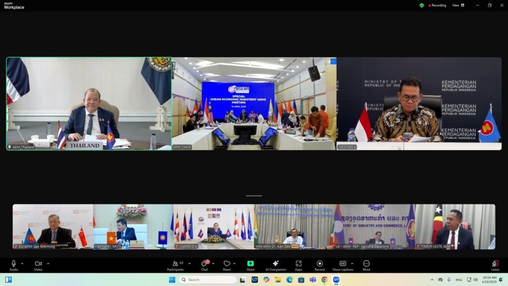 กรุงเทพฯ 10 เม.ย. – รัฐมนตรีเศรษฐกิจอาเซียนเตรียมออกแถลงการณ์ร่วม กรณีภาษีสหรัฐ ระบุเดินหน้าความร่วมมือเศรษฐกิจ พร้อมตั้งคณะทำงานพิเศษ ASEAN Geoeconomics Task Force ติดตามนโยบายสหรัฐฯ ใกล้ชิด พร้อมดึงโอกาสเศรษฐกิจใหม่เข้าอาเซียน รับมือมาตรการภาษี