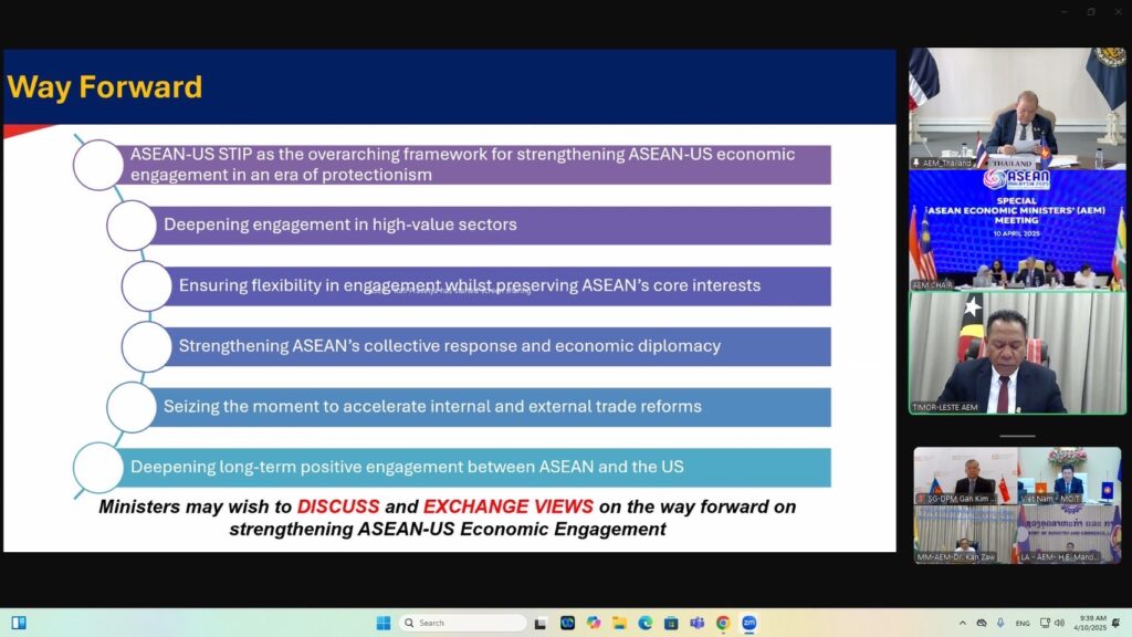 โดยการประชุมครั้งนี้ อาเซียนมีมติจะออกถ้อยแถลงร่วมของรัฐมนตรีเศรษฐกิจอาเซียน เพื่อแสดงจุดยืนของอาเซียน ในฐานะ “หุ้นส่วนยุทธศาสตร์แบบรอบด้าน” กับสหรัฐฯ พร้อมเสนอการเจรจาเชิงสร้างสรรค์ ลดความขัดแย้งทางการค้า และหาทางออกที่สมดุลร่วมกัน ภายใต้กรอบ ASEAN-US Strategic Trade and Investment Partnership (STIP) เพื่อรักษาความสัมพันธ์ระยะยาวทางเศรษฐกิจ การค้า การลงทุน และความมั่นคงทางห่วงโซ่อุปทานในภูมิภาค โดยอาเซียนจะเดินหน้าสร้างความร่วมมือในสาขาศักยภาพสูงกับสหรัฐฯ เช่น ดิจิทัล AI อาหาร พลังงานหมุนเวียน อุตสาหกรรมขั้นสูง รถยนต์ไฟฟ้า เซมิคอนดักเตอร์ สุขภาพ โลจิสติกส์ รวมถึงเกษตรกรรม เพื่อสร้างโอกาสใหม่ให้ภูมิภาค และย้ำถึงความสำคัญของระบบการค้าพหุภาคี โดยอาเซียนจะไม่ตอบโต้ทางการค้าต่อสหรัฐฯ