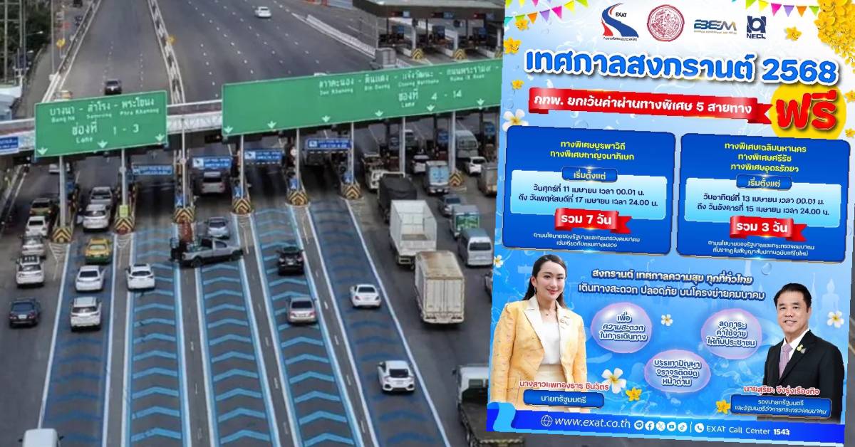 นายสุรเชษฐ์ เหล่าพูลสุข ผู้ว่าการการทางพิเศษแห่งประเทศไทย (กทพ.) กระทรวงคมนาคม เปิดเผยว่า ตามที่ได้มอบนโยบายจากกระทรวงคมนาคม ให้เตรียมความพร้อมรองรับการเดินทางของประชาชน รวมถึงอำนวยความสะดวก และช่วยลดภาระค่าใช้จ่ายของประชาชน ในช่วงเทศกาลสงกรานต์ 2568 จึงได้พิจารณายกเว้นการจัดเก็บค่าผ่านทางพิเศษ เพื่อให้ประชาชนเดินทางด้วยความสะดวก ทั้งนี้ กทพ. ได้ดำเนินการยกเว้นค่าผ่านทางพิเศษ จำนวน 5 สายทาง ดังนี้
