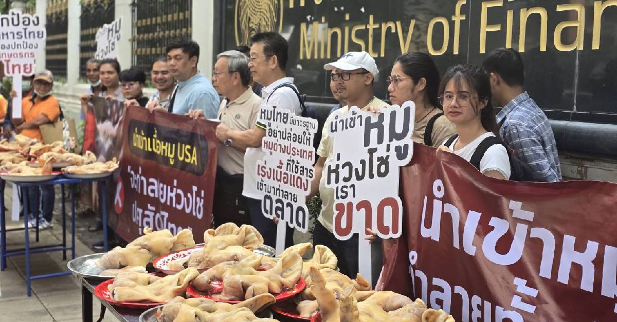 กรุงเทพฯ 10 เม.ย. – นายกสมาคมผู้เลี้ยงสุกรแห่งชาติ นำกลุ่มสมาคมผู้เลี้ยงสุกรยื่นหนังสือถึง “พิชัย” รองนายกฯ ค้านนำเข้า “หมูอเมริกา” หวั่นห่วงโซ่อุปทานพังทั้งระบบและกระทบสุขภาพคนไทยจากสารเร่งเนื้อแดง ตัวแทนผู้เลี้ยงนำหัวหมูมาตั้งบริเวณประตู 2 ของ ก.คลัง จุดธูป เตรียมพริกกับเกลือมาพร้อมเผาเชิงสัญลักษณ์ ลั่นหากภาครัฐยืนยันจะนำเข้าหมูอเมริกา มวลชนจะมามากกว่านี้