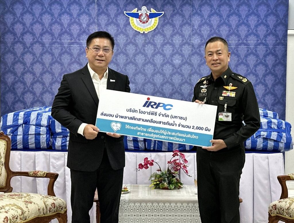 นอกจากนี้ บมจ.ไออาร์พีซี ได้สนับสนุนผ้าพลาสติกสานเคลือบสารกันน้ำ จำนวน 2,000 ผืน ให้แก่กองทัพไทย เพื่อใช้ประโยชน์ในการช่วยเหลือผู้ประสบภัยแผ่นดินไหวในประเทศเมียนมาต่อไป ทั้งนี้ กลุ่ม ปตท.ขอแสดงความเสียใจและส่งกำลังใจให้ผู้ประสบภัยผ่านพ้นเหตุการณ์นี้ไปได้อย่างเข้มแข็ง พร้อมเคียงข้างและส่งมอบความช่วยเหลืออย่างต่อเนื่อง. -511-สำนักข่าวไทย