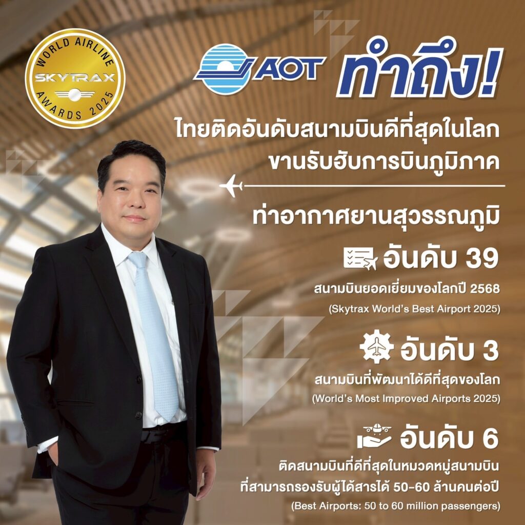 นายกีรติ กิจมานะวัฒน์ กรรมการผู้อำนวยการใหญ่ บริษัท ท่าอากาศยานไทย จำกัด (มหาชน) (AOT) กล่าวว่า จากนโยบายให้ดำเนินการขับเคลื่อนในการพัฒนาอุตสาหกรรมการบินของประเทศไทยเพื่อส่งเสริมการค้า การลงทุน และการท่องเที่ยว สร้างรายได้ฟื้นฟูเศรษฐกิจของประเทศ โดยมุ่งสู่เป้าหมายการผลักดันท่าอากาศยานของไทยให้ติดอันดับ 1 ใน 50 สนามบินที่ดีที่สุดในโลกภายใน 1 ปี และติดอันดับ 1 ใน 20 ของโลกภายใน 5 ปี โดยล่าสุด เว็บไซต์ Skytrax ซึ่งเป็นเว็บไซต์จัดอันดับการให้บริการของสนามบินได้ประกาศสนามบินที่ดีที่สุดในโลก (World’s Best Airport) ประจำปี 2025 ได้จัดอันดับให้ ท่าอากาศยานสุวรรณภูมิ (ทสภ.) ติดอันดับที่ 39 ขยับขึ้นจากอันดับที่ 58 โดยขึ้นมา 19 อันดับจากปีก่อน และยังได้รับการจัดอันดับสนามบินที่พัฒนาได้ดีที่สุดของโลก (The World’s most Improved Airport) ในอันดับที่ 3 ประจำปี 2025 พร้อมกันนี้ ยังติดสนามบินที่ดีที่สุดในหมวดหมู่สนามบินที่สามารถรองรับผู้โดยสาร 50-60 ล้านคนต่อปี (Best Airports: 50 to 60 million passengers) ในอันดับที่ 6 ประจำปี 2025 อีกด้วย