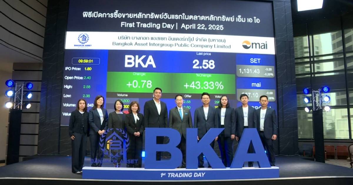 นายประพันธ์ เจริญประวัติ ผู้จัดการตลาดหลักทรัพย์ เอ็ม เอ ไอ (mai) และนายพชร ธนวงศ์เกษม ประธานเจ้าหน้าที่บริหาร บริษัท บางกอก แอสเซท อินเตอร์กรุ๊ป จำกัด (มหาชน) พร้อมด้วยผู้บริหาร ร่วมพิธีเปิดการซื้อขายในตลาดหลักทรัพย์ เอ็ม เอ ไอ เป็นวันแรกของ บมจ. บางกอก แอสเซท อินเตอร์กรุ๊ป ในกลุ่มอุตสาหกรรมอสังหาริมทรัพย์และก่อสร้าง โดยใช้ชื่อย่อในการซื้อขายหลักทรัพย์ “BKA” เปิดเทรดวันแรกที่ระดับราคา 2.40 บาท ปรับเพิ่มขึ้น 0.60 บาท หรือคิดเป็น 33.33% จากราคาเสนอขายหุ้นสามัญเพิ่มทุนให้แก่ประชาชนทั่วไปเป็นครั้งแรก (IPO) ที่ราคา 1.80 บาท