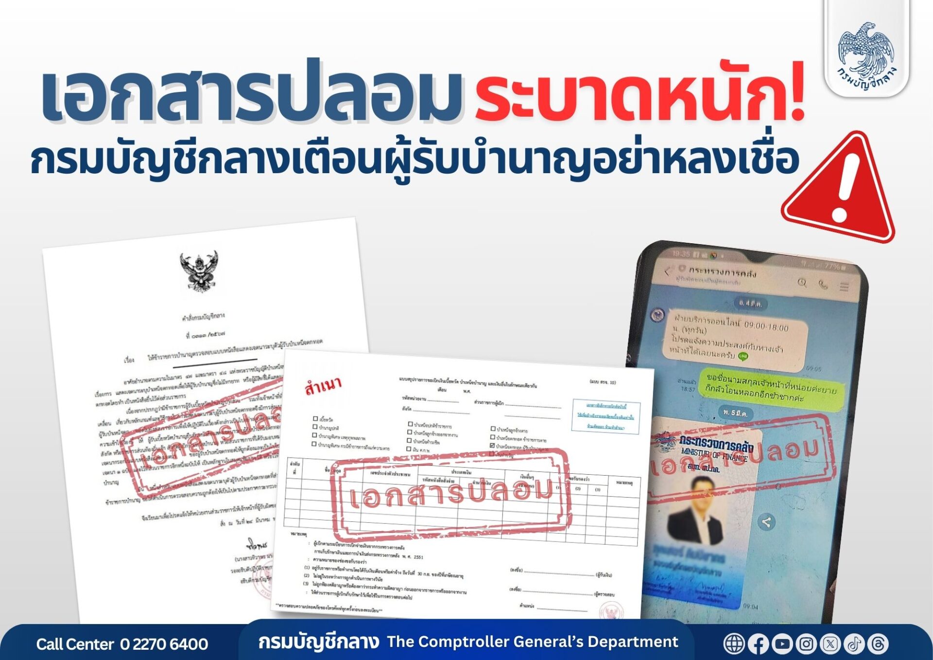 จึงขอให้ติดตามข่าวสารจากกรมบัญชีกลางอย่างใกล้ชิด เพื่อรู้เท่าทันกลโกงรูปแบบใหม่ๆ ที่อาจเกิดขึ้นและที่สำคัญอย่าหลงเชื่อ ไม่คุย ไม่บอกข้อมูลส่วนตัว ไม่ดำเนินการใด ๆ ตามที่มิจฉาชีพแจ้ง หากพบไลน์ปลอมหรือไลน์ ที่ไม่น่าเชื่อถือ รวมทั้งได้รับ sms ที่ส่งลิงก์ต่าง ๆ มาให้กดรับ ห้ามกดรับโดยเด็ดขาด ทั้งนี้ หากมีข้อสงสัยสอบถามได้ที่ Call Center ของกรมบัญชีกลาง หมายเลข 0 2270 6400 ในวัน เวลาราชการ.-515 สำนักข่าวไทย