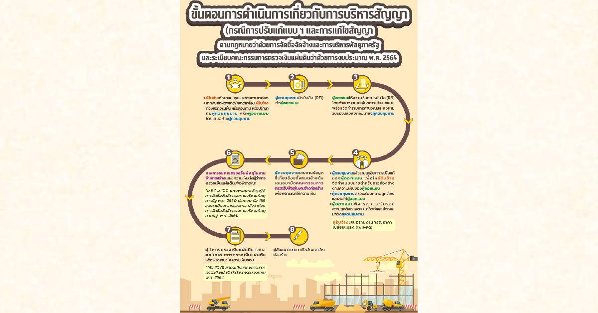 - ผู้ควบคุมงาน รายงานข้อมูลที่เกี่ยวข้องทั้งหมด และเสนอมายังคณะกรรมการตรวจรับพัสดุ ในงานจ้างก่อสร้างเพื่อพิจารณาให้ความเห็น 6. คณะกรรมการตรวจรับพัสดุในงานจ้างก่อสร้างเสนอความเห็นต่อผู้ว่าการตรวจเงินแผ่นดิน ในฐานะผู้ว่าจ้าง เพื่อพิจารณาอนุมัติการแก้ไขสัญญา 7. ผู้ว่าการ สตง. จึงเสนอ คตง. พิจารณาให้ความเห็น โดยไม่เพิ่มวงเงินก่อหนี้ผูกพัน 8. คู่สัญญาลงนามการแก้ไขสัญญาจ้างก่อสร้าง โดยนำแบบรูปและรายการละเอียดที่แก้ไขเพื่อเป็นเอกสารอันเป็นส่วนหนึ่งของสัญญา จึงยืนยันว่าการแก้ไขสัญญา ทำตามกฎหมายว่าด้วยการจัดซื้อจัดจ้างและการบริหารพัสดุภาครัฐ และระเบียบคณะกรรมการตรวจเงินแผ่นดินว่าด้วยการงบประมาณ 2564. -515-สำนักข่าวไทย