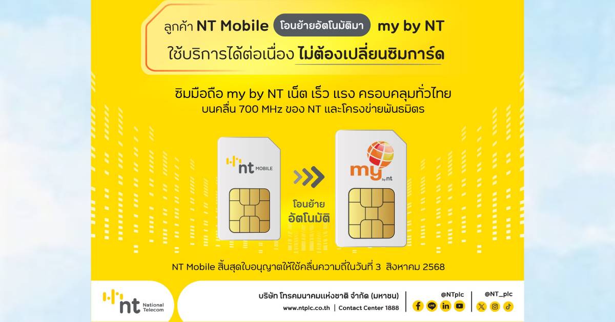 ฝ่ายประชาสัมพันธ์ NT แจ้งว่าผู้ใช้บริการโทรศัพท์เคลื่อนที่ NT Mobile สามารถใช้งานโทรศัพท์เคลื่อนที่ได้อย่างต่อเนื่อง โดยจะโอนย้ายผู้ใช้บริการ NT Mobile ขึ้นสู่โครงข่ายบริการ my by NT บนคลื่นความถี่ 700 MHz โดยอัตโนมัติในเดือนมิถุนายน 2568 โดยไม่จำเป็นต้องเปลี่ยนซิมการ์ด ซึ่งเมื่อโอนย้ายสำเร็จ ผู้ใช้บริการจะได้รับ SMS แจ้งต้อนรับพร้อมแจ้งรายละเอียดแพ็กเกจ และการตั้งค่า APN สำหรับใช้งานอินเทอร์เน็ต โดยแนะนำให้ปิด – เปิดเครื่อง 1 ครั้ง เพื่อเริ่มใช้งานต่อไป