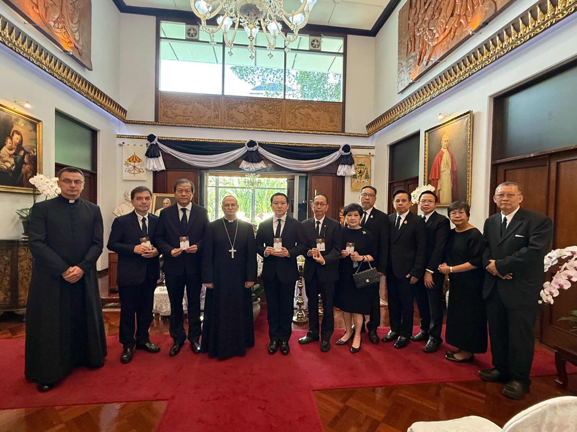 พระอัครสังฆราชปีเตอร์ ไบรอัน เวลส์ เอกอัครสมณทูตนครรัฐวาติกันประจำประเทศไทย กัมพูชา และผู้แทนพระสันตะปาปาประจำประเทศลาว ให้การต้อนรับ นายฐาปน สิริวัฒนภักดี ประธานเจ้าหน้าที่บริหาร บริษัท ไทยเบฟเวอเรจ จำกัด (มหาชน) ศาสตราจารย์ ดร.อภินันท์ โปษยานนท์ นายดุสิต เขมะศักดิ์ชัย นายนิติกร กรัยวิเชียร นายวิรัช เมฆสัมพันธ์ นายแพทริค หอรัตนชัย และคณะ ที่มาร่วมถวายความอาลัยแด่สมเด็จพระสันตะปาปาฟรันซิส ณ สถานเอกอัครสมณทูตนครรัฐวาติกันประจำประเทศไทย