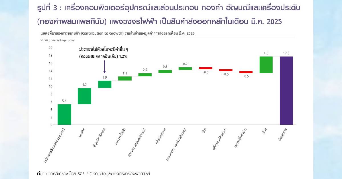 ศูนย์วิจัยกสิกรไทย ระบุการส่งออกไทย เดือน มี.ค.68 ขยายตัวสูงสุดในรอบ 3 ปี จากการเร่งนำเข้าสินค้า ส่งออกไทย ไปตลาดหลักเติบโตทุกตลาด โดยเฉพาะการส่งออกคอมพิวเตอร์และส่วนประกอบ ในขณะที่ไตรมาสที่ 2/2568 การส่งออกไทยคาดว่าจะยังขยายตัวเป็นบวกแต่ชะลอลงจากไตรมาสแรกอย่างมีนัยสำคัญ จากการเร่งส่งออกไปในช่วงก่อนหน้าและปัจจัยฐาน ขณะที่ครึ่งปีหลังคาดอาจหดตัว ศูนย์วิจัยกสิกรไทย จึงคาดการณ์ปรับลดประมาณการส่งออกไทยในปี 2568 หดตัว 0.5% จากก่อนหน้าที่คาดว่าอาจขยายตัว 2.5% โดยยังขึ้นอยู่กับผลการเจรจาของรัฐบาลกับสหรัฐฯ