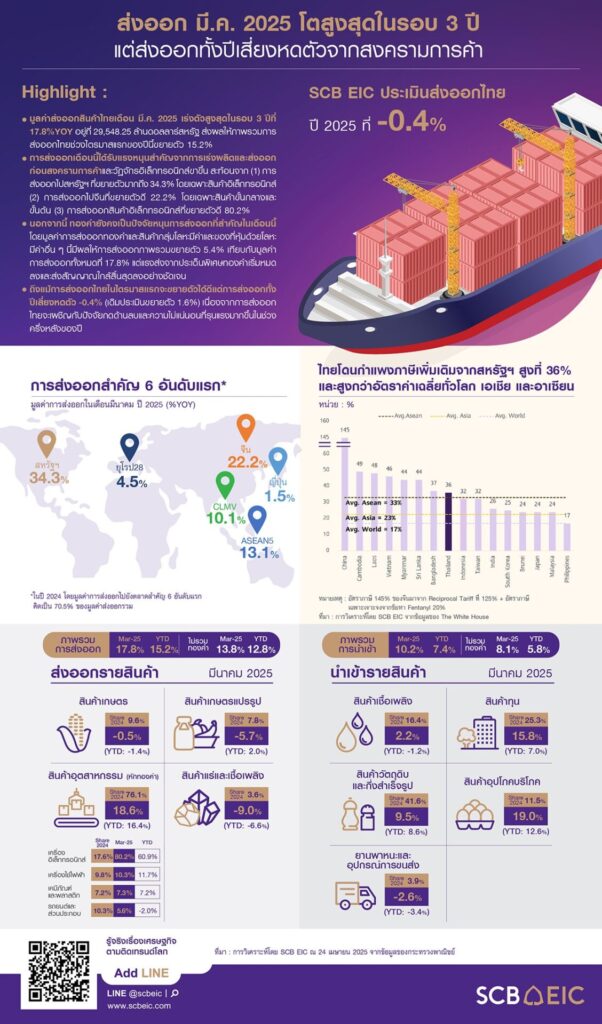 ด้าน SCB EIC ประเมินว่าการส่งออกไทยในช่วงครึ่งหลังของปีจะเผชิญปัจจัยกดดันและความไม่แน่นอนที่รุนแรงมากขึ้น มูลค่าการส่งออกในช่วงครึ่งหลังของปีจะหดตัวรุนแรง โดยเฉพาะไตรมาสสุดท้าย ส่งผลให้มูลค่าการส่งออกทั้งปีเสี่ยงหดตัว 0.4% จากเดิมที่คาดว่าจะขยายตัว 1.6% (ตัวเลขระบบดุลการชำระเงิน, มุมมอง ณ มี.ค. 2025) สาเหตุหลักมาจาก