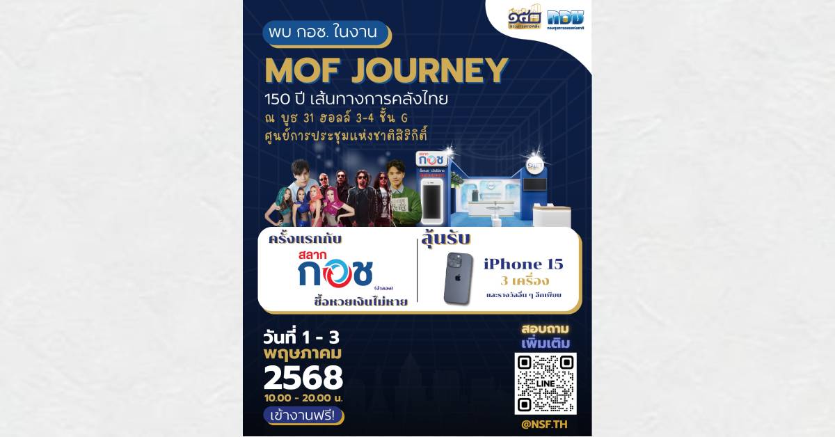 กองทุนการออมแห่งชาติ (กอช.) ขอเชิญชวนประชาชนเข้าร่วมงาน “MOF JOURNEY 150 ปี เส้นทางการคลังไทย” เพื่อร่วมเฉลิมฉลองวาระครบรอบ 150 ปี กระทรวงการคลัง ระหว่างวันที่ 1– 3 พฤษภาคม 2568 เวลา 10.00 – 20.00 น. ณ ศูนย์การประชุมแห่งชาติสิริกิติ์ ฮอลล์ 3 – 4 ชั้น G