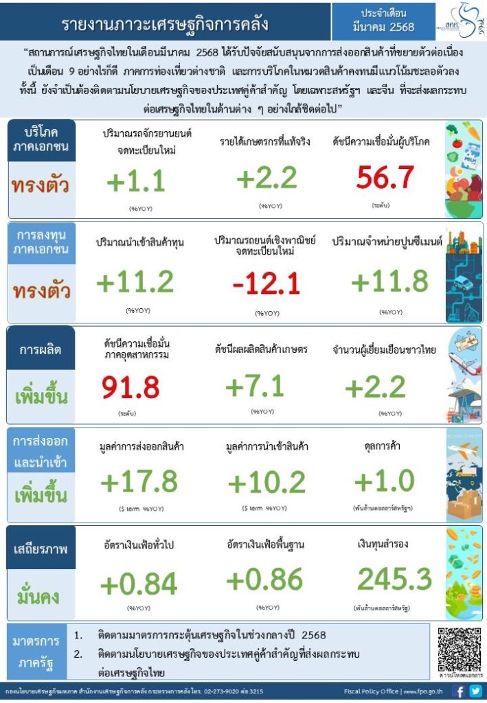 นายพรชัย ฐีระเวช ผู้อำนวยการสำนักงานเศรษฐกิจการคลัง เปิดเผยว่า ภาวะเศรษฐกิจการคลังประจำเดือนมีนาคม 68 ได้รับปัจจัยสนับสนุนจากการส่งออกสินค้า ขยายตัวต่อเนื่องเป็นเดือน 9 ยอมรับภาคการท่องเที่ยวต่างชาติ และการบริโภคในหมวดสินค้าคงทนมีแนวโน้มชะลอตัวลง ขณะนี้ต้องติดตามนโยบายเศรษฐกิจของประเทศคู่ค้าสำคัญอย่างใกล้ชิดโดยเฉพาะสหรัฐฯ และจีน อาจส่งผลกระทบต่อเศรษฐกิจไทยในด้านต่าง ๆ
