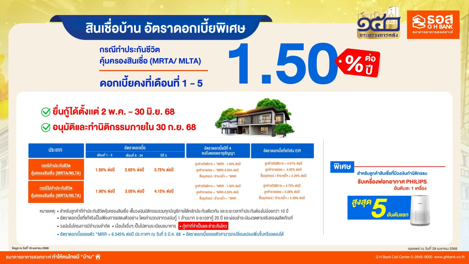 (1)สินเชื่อบ้านอัตราดอกเบี้ยต่ำพิเศษ : กรอบวงเงิน 3,000 ล้านบาท สำหรับการกู้ทุกวัตถุประสงค์การกู้ (กู้ใหม่หรือกู้เพิ่ม) สำหรับลูกค้าที่มีความประสงค์ทำประกันชีวิตคุ้มครองสินเชื่อ (MRTA/MLTA) อัตราดอกเบี้ยต่ำพิเศษคงที่นาน 5 เดือนแรกเพียง 1.50% ต่อปี, เดือนที่ 6 – 24 เท่ากับ 2.65% ต่อปี, ปีที่ 3 เท่ากับ 3.75% ต่อปี อัตราดอกเบี้ยเฉลี่ย 3 ปีแรก เท่ากับ 2.85%, ปีที่ 4 จนถึงตลอดอายุสัญญา กรณีลูกค้าสวัสดิการ เท่ากับ MRR-1.00% ต่อปี, กรณีลูกค้ารายย่อย เท่ากับ MRR-0.50% ต่อปี และชำระหนี้ ฯ/ซื้ออุปกรณ์ เท่ากับ MRR (อัตราดอกเบี้ย MRR ของ ธอส. ปัจจุบันเท่ากับ 6.545% ต่อปี) ระยะเวลาการกู้นานสูงสุด 40 ปี กรณีกู้ 1 ล้านบาท ผ่อนชำระเงินงวดเริ่มต้นเพียงเดือนละ 3,400 บาทเท่านั้น โดยผู้ที่สนใจ สามารถจองสิทธิ์ภายในงาน และยื่นขอสินเชื่อได้ตั้งแต่วันที่ 2 พฤษภาคม – 30 มิถุนายน 2568 อนุมัติและทำนิติกรรมภายในวันที่ 30 กันยายน 2568 พิเศษ! สำหรับลูกค้าที่มีวงเงินนิติกรรมสูงสุด 5 อันดับแรก รับฟรี เครื่องฟอกอากาศ อันดับละ 1 เครื่อง (เงื่อนไขเป็นไปตามที่ธนาคารกำหนด)
