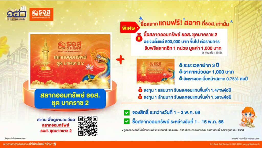 ผู้ที่ซื้อสลากออมทรัพย์ ธอส. วงเงินตั้งแต่ 500,000 บาท ขึ้นไปต่อรายการ รับฟรีสลากออมทรัพย์ ธอส. ชุดนาคราช 2 จำนวน 1 หน่วย มูลค่า 1,000 บาท จำนวน 1 ท่านต่อ 1 สิทธิ์ (เงื่อนไขเป็นไปตามที่ธนาคารกำหนด) ผู้ที่สนใจสามารถจองสิทธิ์ภายในงาน และซื้อสลากออมทรัพย์ ธอส. ชุดนาคราช 2 ได้ที่สาขาธนาคารตั้งแต่วันที่ 1 – 15 พฤษภาคม 2568