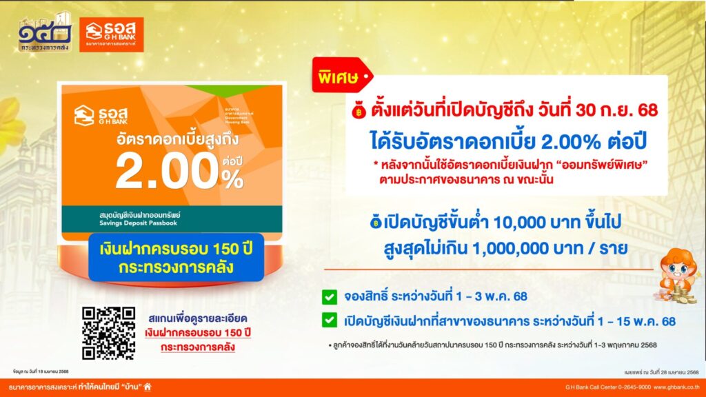 (3) เงินฝากครบรอบ 150 ปี กระทรวงการคลัง : กรอบวงเงิน 1,500 ล้านบาท อัตราดอกเบี้ยสูงถึง 2.00% ต่อปี ตั้งแต่วันที่เปิดบัญชีถึงวันที่ 30 กันยายน 2568 เพียงจองสิทธิ์ภายในงาน และเปิดบัญชีขั้นต่ำ 10,000 บาทขึ้นไป แต่สูงสุดไม่เกิน 1 ล้านบาทต่อราย โดยผู้ที่สนใจสามารถจองสิทธิ์ภายในงาน และเปิดบัญชีเงินฝากได้ที่สาขาธนาคารตั้งแต่วันที่ 1 – 15 พฤษภาคม 2568