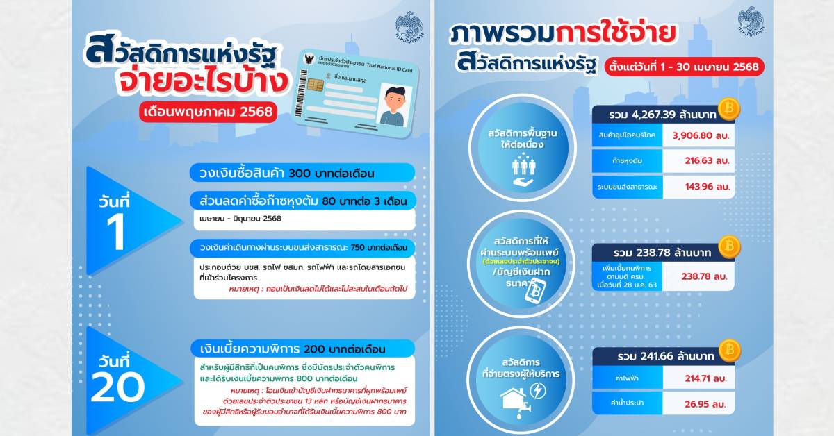 กรุงเทพฯ 6 พ.ค. – นางสาวทิวาพร ผาสุข รองอธิบดีกรมบัญชีกลาง ในฐานะโฆษกกรมบัญชีกลาง เปิดเผยว่า โครงการลงทะเบียนเพื่อสวัสดิการแห่งรัฐ ปี 2565 ผู้มีสิทธิสามารถใช้สิทธิผ่านบัตรประจำตัวประชาชนแบบสมาร์ทการ์ด ซึ่งในเดือนพฤษภาคม 2568 จะได้รับสิทธิ ดังนี้