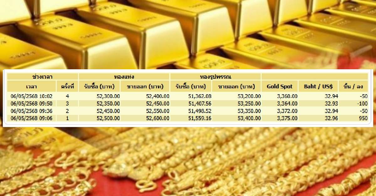 สมาคมค้าทองคำ ประกาศราคาทองคำในเช้าวันนี้ (6 พ.ค.) จนถึงเวลา 10.02 น.มีการเปลี่ยนแปลง 4 รอบ โดยเปิดตลาดวันนี้ ราคาพุ่งขึ้น 950 บาท/บาททองคำ โดยทองคำแท่งรับซื้อ 52,500.00 บาท ขายออก 52,600.00 บาท ส่วนทองคำรูปพรรณ รับซื้อ 51,559.16 บาท ขายออก 53,400.00 บาท บนฐานเงินบาท 32.96 บาท/ดอลลาร์สหรัฐ ราคา GOLD SPOT 3,375 ดอลลาร์สหรัฐ/ออนซ์ โดยราคาทองคำขึ้นตามราคาตลาดโลก แต่จากเงินบาทแข็งค่าจึงทำให้ราคาในไทยไม่ปรับเพิ่มสูงขึ้นมากนัก โดยสัญญาทองคำตลาดนิวยอร์กปิดพุ่งขึ้นวานนี้ (5 พ.ค.) สัญญาทองคำตลาด COMEX (Commodity Exchange) ส่งมอบเดือน มิ.ย.เพิ่มขึ้น 79 ดอลลาร์ หรือ 2.44% ปิดที่ 3,322.30 ดอลลาร์/ออนซ์ ปัจจัยหนุนจากการอ่อนค่าของสกุลเงินดอลลาร์ และจากแรงซื้อสินทรัพย์ปลอดภัย ในช่วงสงครามการค้า ขณะที่นักลงทุนจับตาการประชุมนโยบายการเงินของธนาคารกลางสหรัฐฯ (เฟด) ในสัปดาห์นี้ประชุมวันที่ 6-7 พ.ค. ตลาดคาดการณ์ว่าคณะกรรมการเฟดจะคงอัตราดอกเบี้ยที่ระดับ 4.25-4.50%
