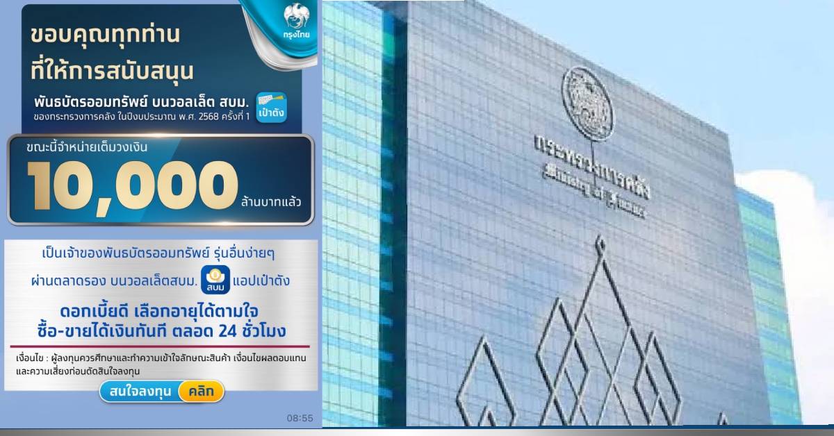 ผู้สื่อข่าวรายงานว่า หลังกระทรวงการคลังเปิดจำหน่ายพันธบัตรออมทรัพย์บนวอลเล็ต สบม. ในปีงบประมาณ 2568 ครั้งที่ 1 รุ่นอายุ 7 ปี ให้ดอกเบี้ยผลตอบแทนคงที่ร้อยละ 2.65 วงเงิน 10,000 ล้านบาท เปิดให้ซื้อขั้นต่ำ 100 บาท วงเงินซื้อต่อครั้งสูงสุดไม่เกิน 20 ล้านบาท (ครั้งละไม่เกิน 5 ล้านบาท) เริ่มตั้งแต่เวลา 08.30 น.วันนี้ นับว่ามีนักลงทุนรายย่อยสนใจซื้อพันธบัตรออมทรัพย์ รุ่นอายุ 7 ปี ผ่านแอปเป๋าตังจำนวนมาก ทำให้ใช้เวลาเพียงครึ่งชั่วโมงแรก สามารถจำหน่ายเต็มวงเงิน 10,000 ล้านบาท