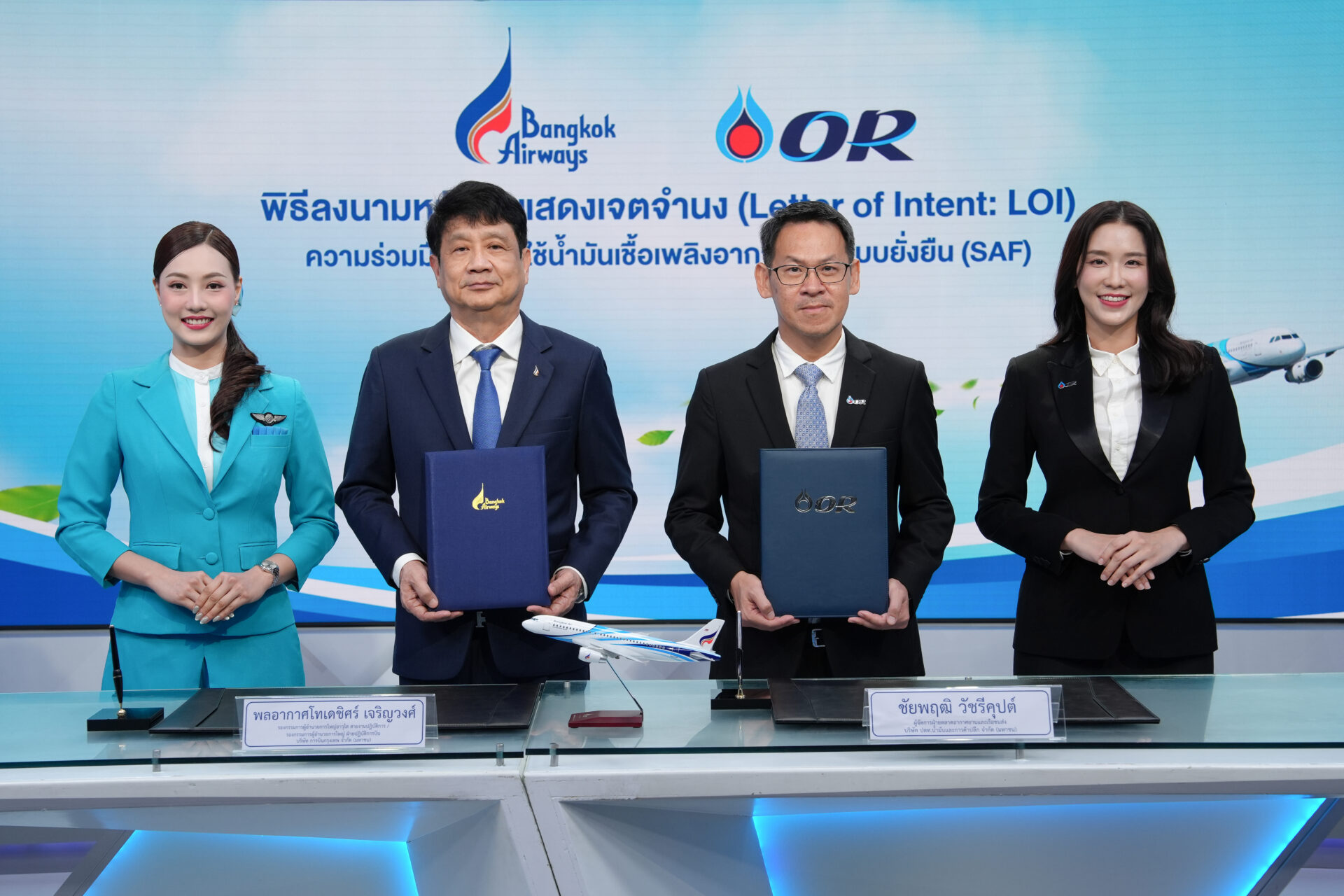 นายชัยพฤฒิ วัชรีคุปต์ ผู้จัดการฝ่ายตลาดอากาศยานและเรือขนส่ง บริษัท ปตท.น้ำมันและการค้าปลีก จำกัด (มหาชน) (OR) และนายเดชิศร์ เจริญวงศ์ รองกรรมการผู้อำนวยการใหญ่อาวุโส สายงานปฏิบัติการ รองกรรมการผู้อำนวยการใหญ่ ฝ่ายปฏิบัติการบิน บริษัท การบินกรุงเทพ จำกัด (มหาชน) หรือ สายการบินบางกอกแอร์เวยส์ ร่วมลงนามหนังสือแสดงเจตจำนง (LOI) เรื่อง การซื้อน้ำมันเชื้อเพลิงอากาศยานแบบยั่งยืน (Sustainable Aviation Fuel: SAF) โดยผู้ผลิตภายในประเทศเป็นครั้งแรกของประเทศไทย สำหรับใช้ปฏิบัติการบินในเที่ยวบินของสายการบินบางกอกแอร์เวย์ส ณ สำนักงานใหญ่สายการบินบางกอกแอร์เวย์ส ถนนวิภาวดีรังสิต ตอบโจทย์เป้าหมายการพัฒนาอย่างยั่งยืนของทั้งสองบริษัท พร้อมผลักดันอุตสาหกรรมการบินของประเทศไทยก้าวสู่อนาคตการบินที่เป็นมิตรต่อสิ่งแวดล้อม