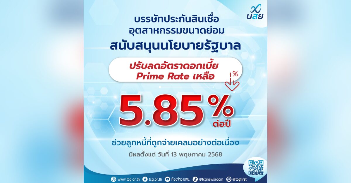 กรุงเทพฯ 9 พ.ค.- บสย. ลดดอกเบี้ย Prime Rate ครั้งที่ 2 ของปี เหลือ 5.85% ต่อปี มีผล 13 พ.ค.นี้
