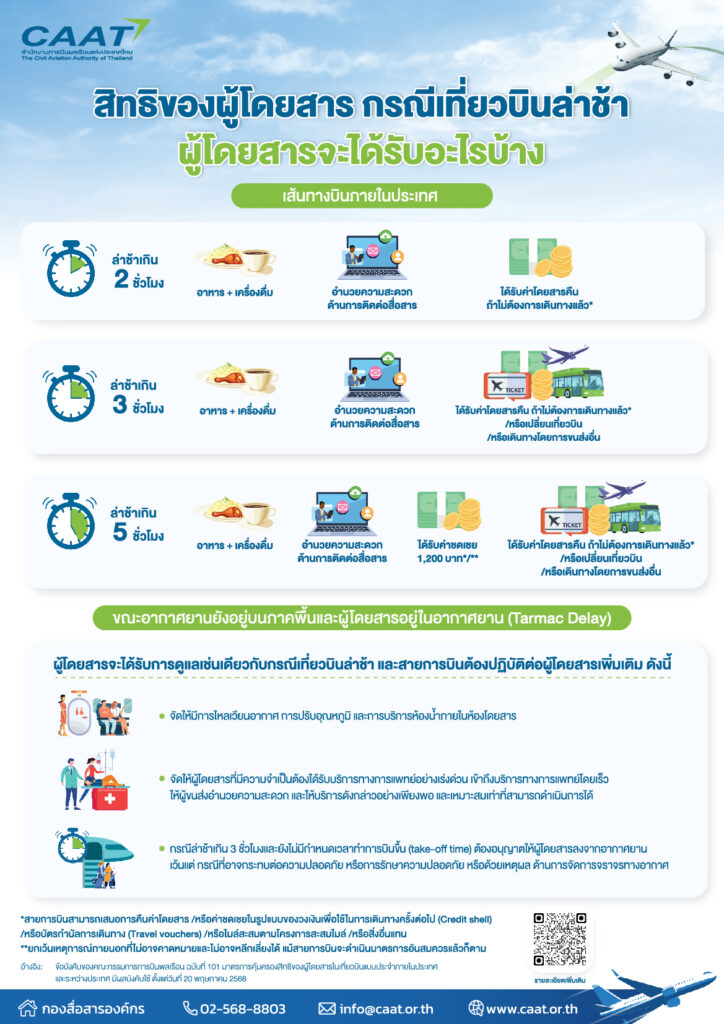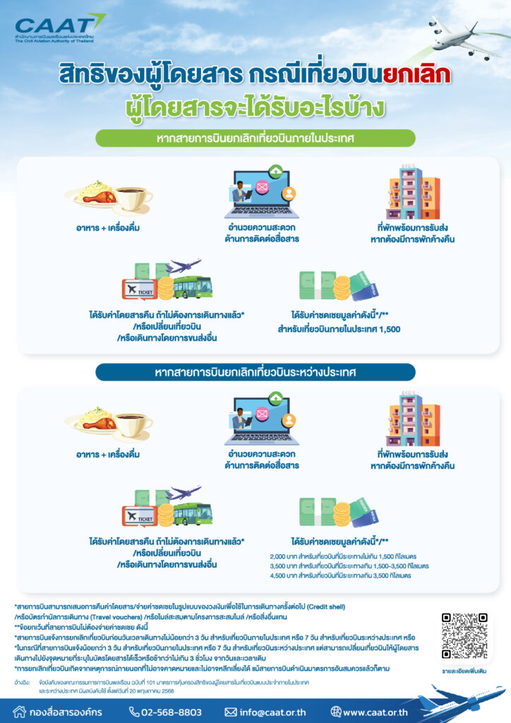 คณะกรรมการการบินพลเรือน (กบร.) ซึ่งมีนายสุริยะ จึงรุ่งเรืองกิจ รองนายกรัฐมนตรี และรัฐมนตรีว่าการกระทรวงคมนาคมเป็นประธาน ออกข้อบังคับของคณะกรรมการการบินพลเรือน ฉบับที่ 101 มาตรการคุ้มครองสิทธิของผู้โดยสารเที่ยวบินแบบประจำในประเทศและระหว่างประเทศ มีผลบังคับใช้ตั้งแต่วันที่ 20 พฤษภาคม 2568 เป็นต้นไป ข้อบังคับฉบับใหม่นี้ ได้เพิ่มความคุ้มครองสิทธิของผู้โดยสารกรณีเที่ยวบินระหว่างประเทศล่าช้าหรือยกเลิก โดยไม่ได้แจ้งผู้โดยสารล่วงหน้าและผู้โดยสารเดินทางถึงสนามบินแล้ว