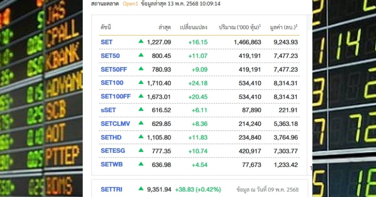 ขณะที่หุ้นไทย เปิดบวก บวก 20 จุด และเมื่อเวลา 10.09 น. ย่อลงเล็กน้อย บวก 16.15 จุด ดัชนีเคลื่อนไหว ที่ 1,227.09 จุด นับว่าหุ้นไทยสดใส ตามหุ้นทั่วโลก หลังจีน-สหรัฐฯ บรรลุข้อตกลงยอมลดภาษีศุลกากรประเทศละ 115% ช่วง 90 วัน ส่งผลให้ภาษีของสหรัฐฯ เก็บจากสินค้าจีนลดลงเหลือ 30% จากเดิม 145% ขณะที่จีนเรียกเก็บภาษีนำเข้าจากสหรัฐฯ เหลือ 10% จากเดิม 125% ทำให้ตลาดคลายความวิตกสงครามการค้า